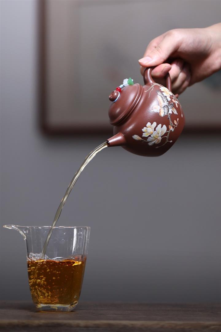 【泥料特點】砂土氣重,似淳實農民,日久使用,漸露鋒芒,養成變化,溫潤莊重。紫砂是壹種雙重氣孔結構的多孔性材質,氣孔微細,密度高。用紫砂壺沏茶,不失原味,且香不渙散,得茶之真香真味。紫砂使用越久,壺身色澤越發光亮照人,氣韻溫雅。紫砂壺長久使用器身會因撫摸擦拭,變得越發溫潤光澤。