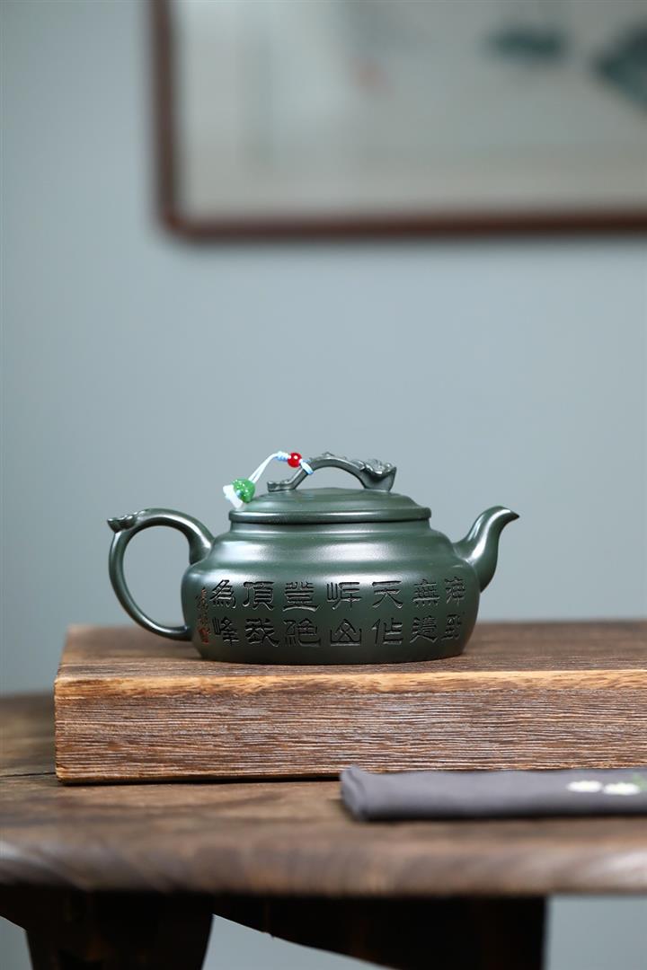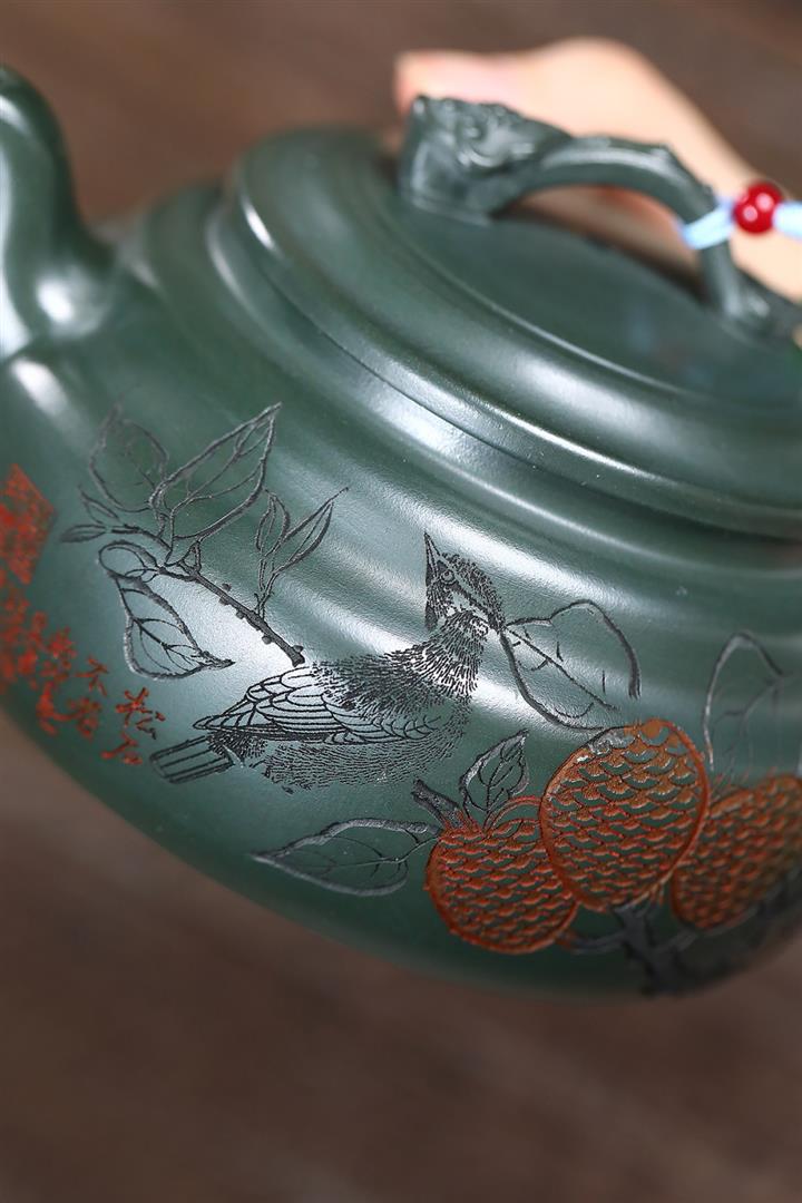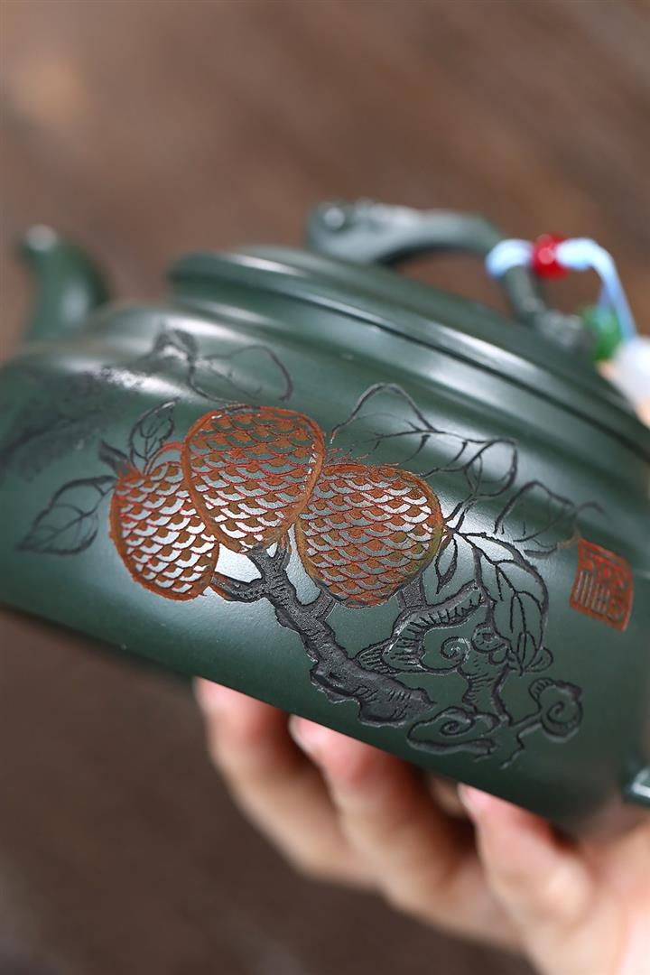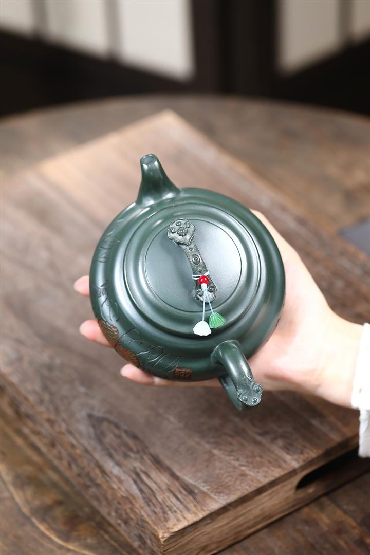 400cc原礦墨綠泥刻繪如意松趣茶壺POT8304