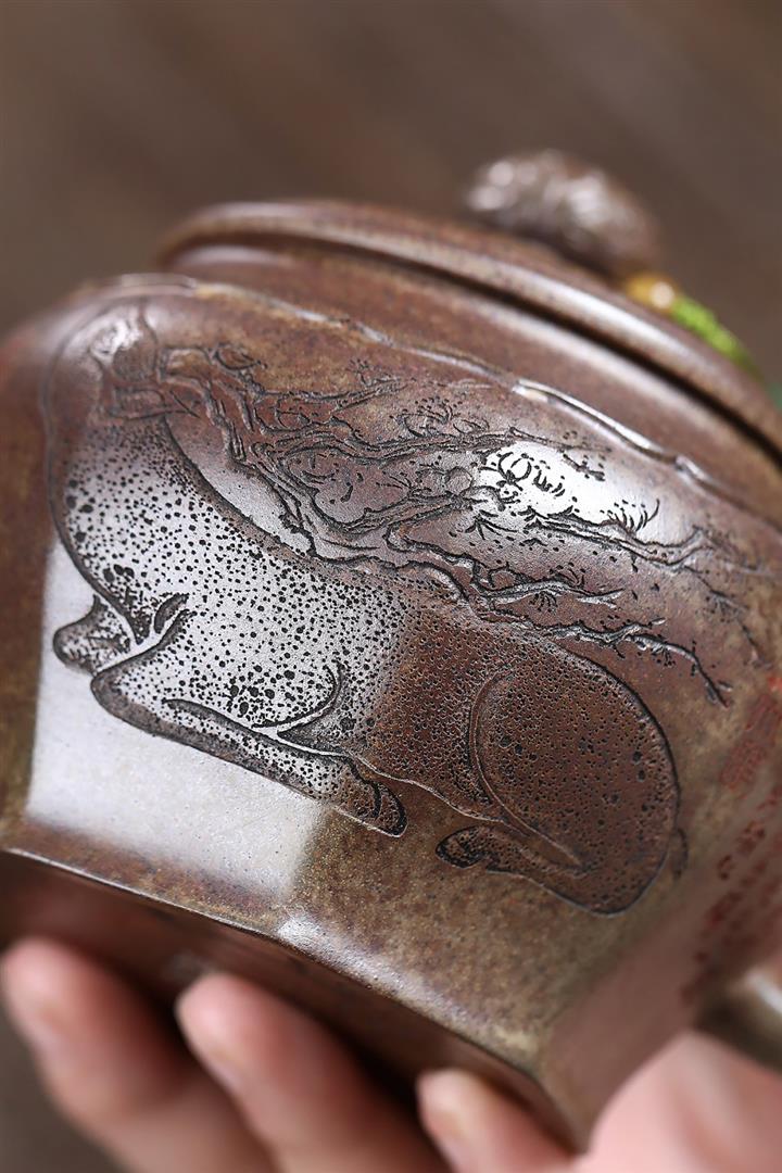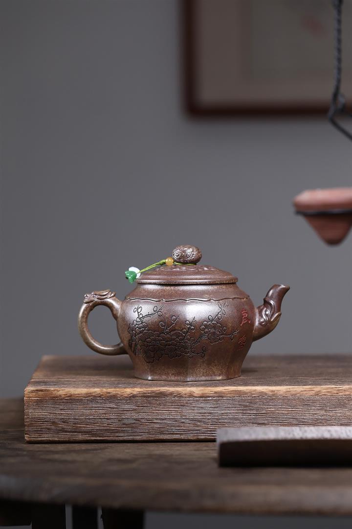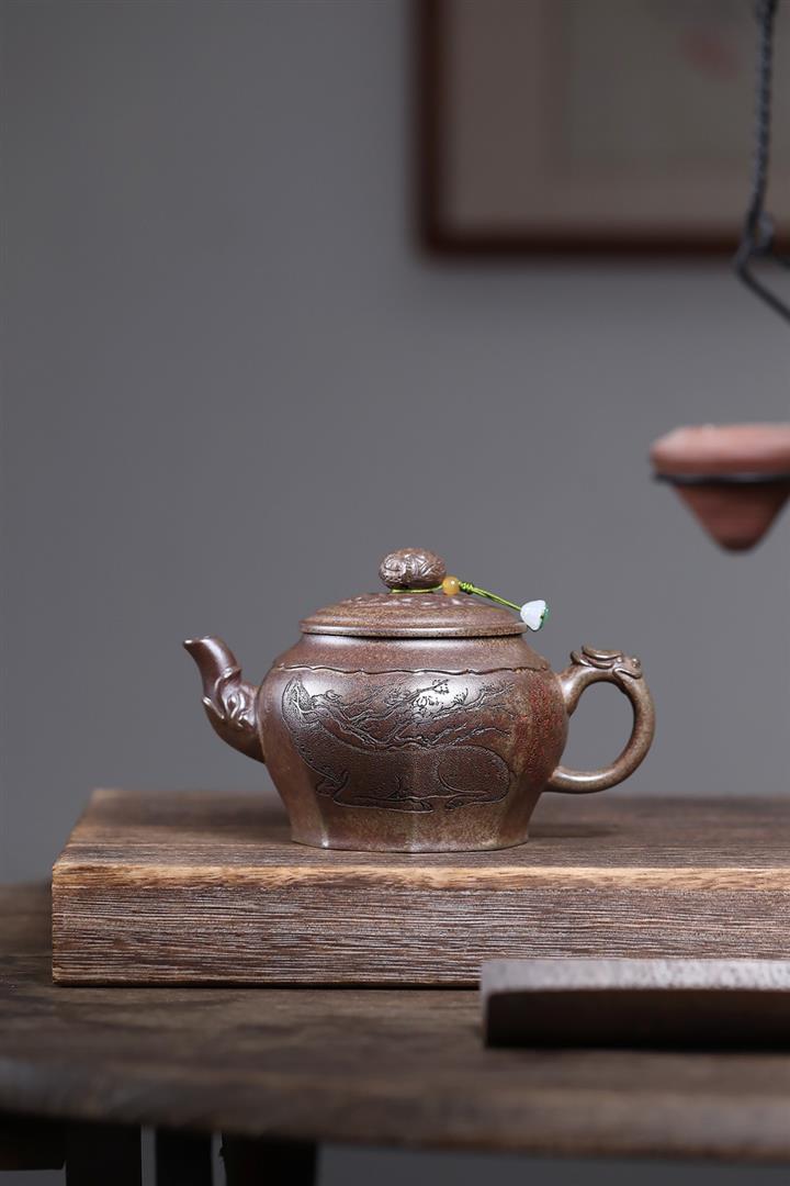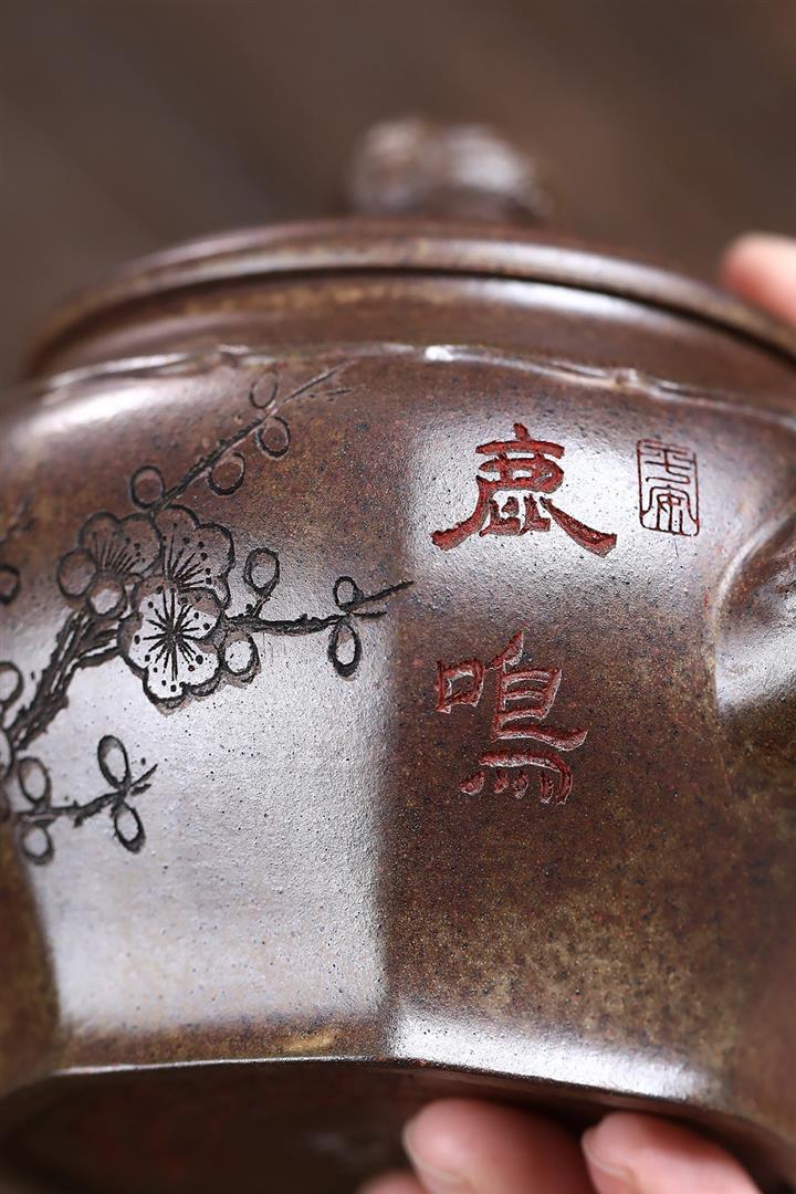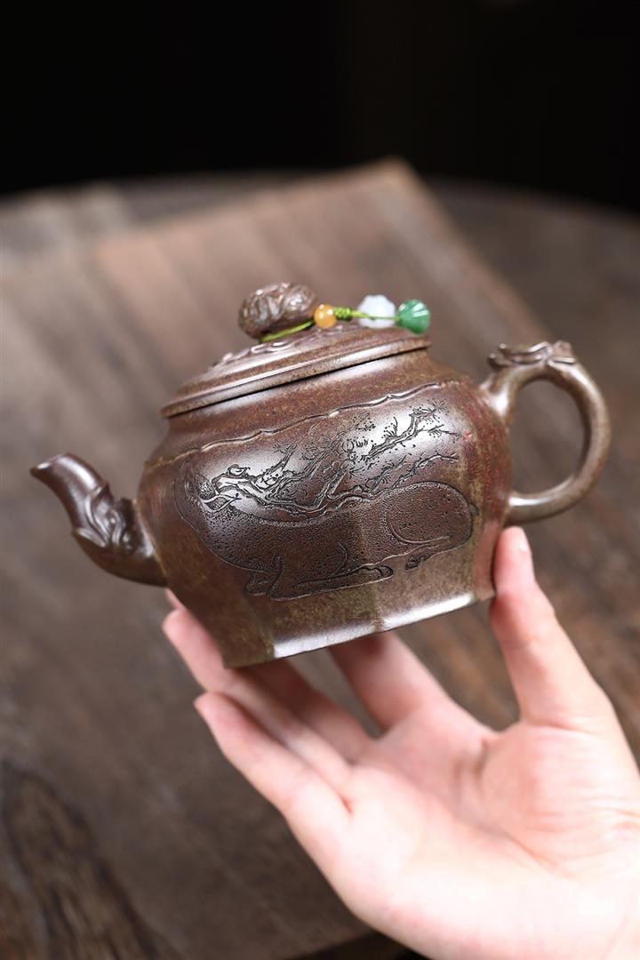 紫砂壺全手工刻繪原礦紫泥六方汲直壺pot3702