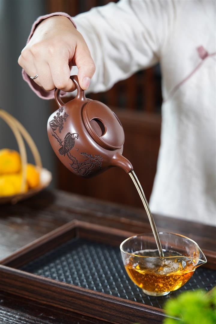 【泥料特點】砂土氣重,似淳實農民,日久使用,漸露鋒芒,養成變化,溫潤莊重。紫砂是壹種雙重氣孔結構的多孔性材質,氣孔微細,密度高。用紫砂壺沏茶,不失原味,且香不渙散,得茶之真香真味。紫砂使用越久,壺身色澤越發光亮照人,氣韻溫雅。紫砂壺長久使用器身會因撫摸擦拭,變得越發溫潤光澤。