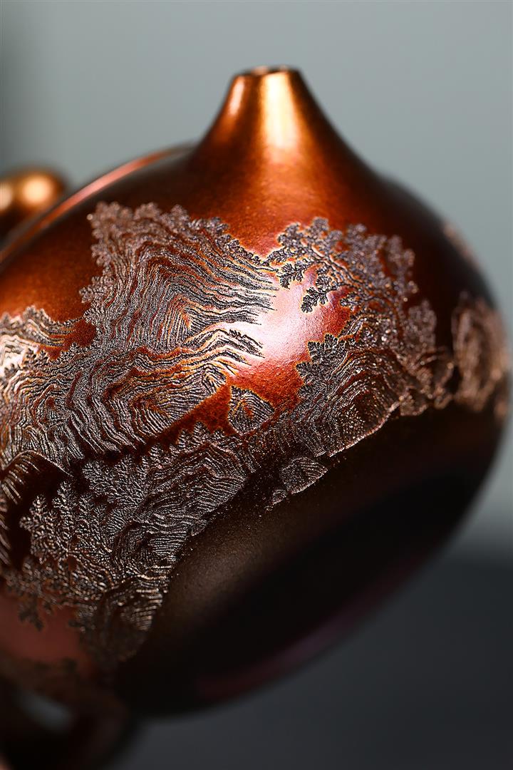 【泥料特點】砂土氣重,似淳實農民,日久使用,漸露鋒芒,養成變化,溫潤莊重。紫砂是壹種雙重氣孔結構的多孔性材質,氣孔微細,密度高。用紫砂壺沏茶,不失原味,且香不渙散,得茶之真香真味。紫砂使用越久,壺身色澤越發光亮照人,氣韻溫雅。紫砂壺長久使用器身會因撫摸擦拭,變得越發溫潤光澤。