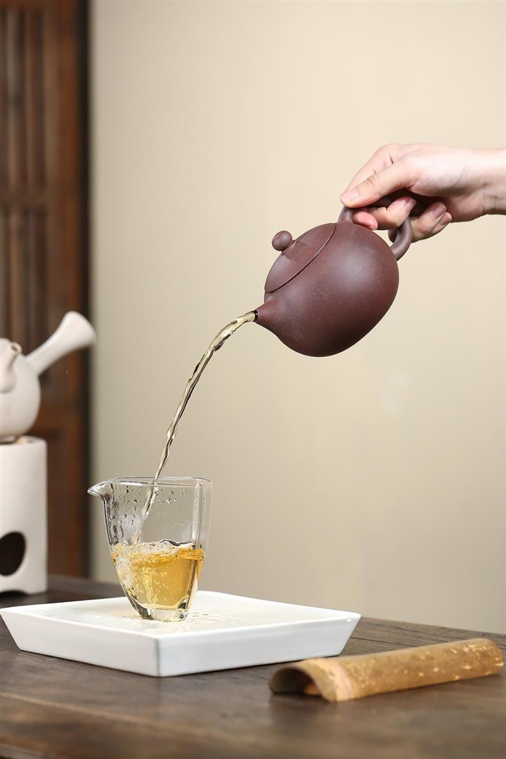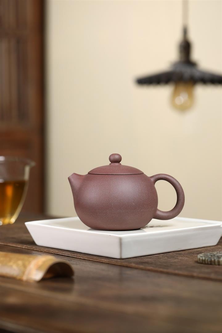 【泥料特點】砂土氣重,似淳實農民,日久使用,漸露鋒芒,養成變化,溫潤莊重。紫砂是壹種雙重氣孔結構的多孔性材質,氣孔微細,密度高。用紫砂壺沏茶,不失原味,且香不渙散,得茶之真香真味。紫砂使用越久,壺身色澤越發光亮照人,氣韻溫雅。紫砂壺長久使用器身會因撫摸擦拭,變得越發溫潤光澤。