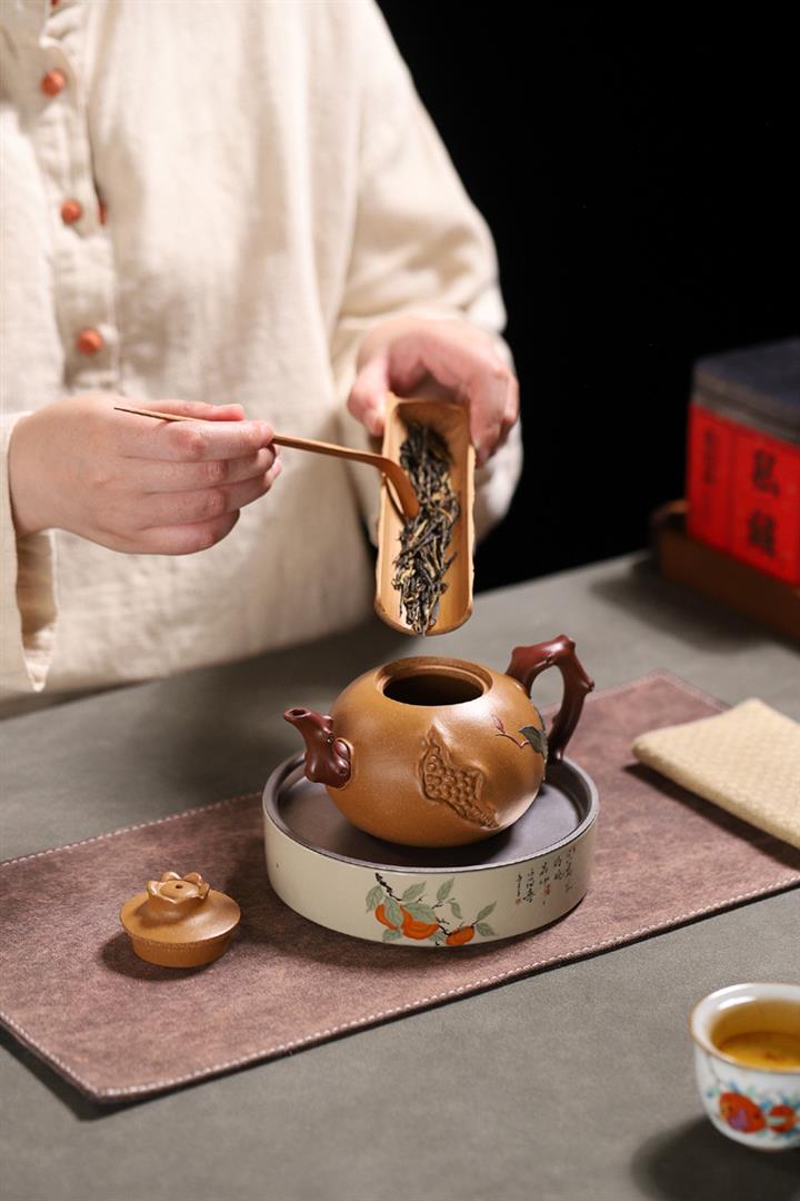 【泥料特點】砂土氣重,似淳實農民,日久使用,漸露鋒芒,養成變化,溫潤莊重。紫砂是壹種雙重氣孔結構的多孔性材質,氣孔微細,密度高。用紫砂壺沏茶,不失原味,且香不渙散,得茶之真香真味。紫砂使用越久,壺身色澤越發光亮照人,氣韻溫雅。紫砂壺長久使用器身會因撫摸擦拭,變得越發溫潤光澤。