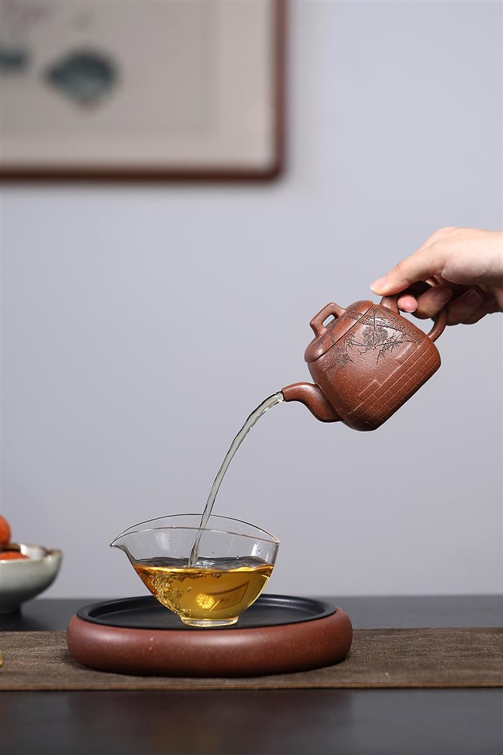 【泥料特點】砂土氣重,似淳實農民,日久使用,漸露鋒芒,養成變化,溫潤莊重。紫砂是壹種雙重氣孔結構的多孔性材質,氣孔微細,密度高。用紫砂壺沏茶,不失原味,且香不渙散,得茶之真香真味。紫砂使用越久,壺身色澤越發光亮照人,氣韻溫雅。紫砂壺長久使用器身會因撫摸擦拭,變得越發溫潤光澤。