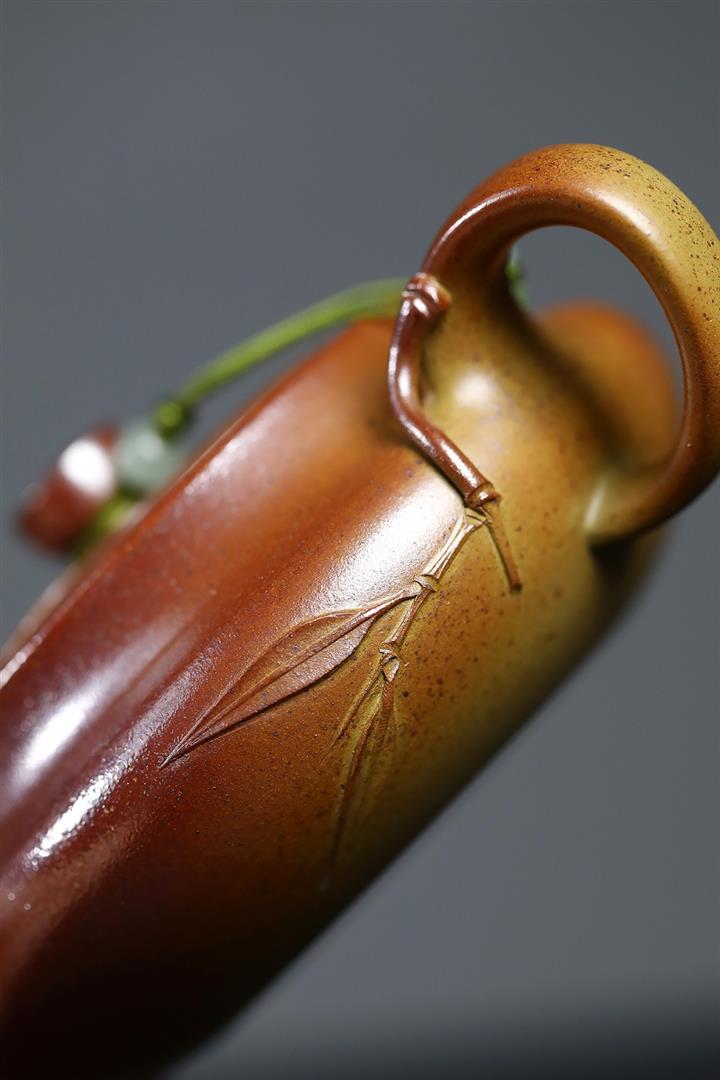 【泥料特點】砂土氣重,似淳實農民,日久使用,漸露鋒芒,養成變化,溫潤莊重。紫砂是壹種雙重氣孔結構的多孔性材質,氣孔微細,密度高。用紫砂壺沏茶,不失原味,且香不渙散,得茶之真香真味。紫砂使用越久,壺身色澤越發光亮照人,氣韻溫雅。紫砂壺長久使用器身會因撫摸擦拭,變得越發溫潤光澤。