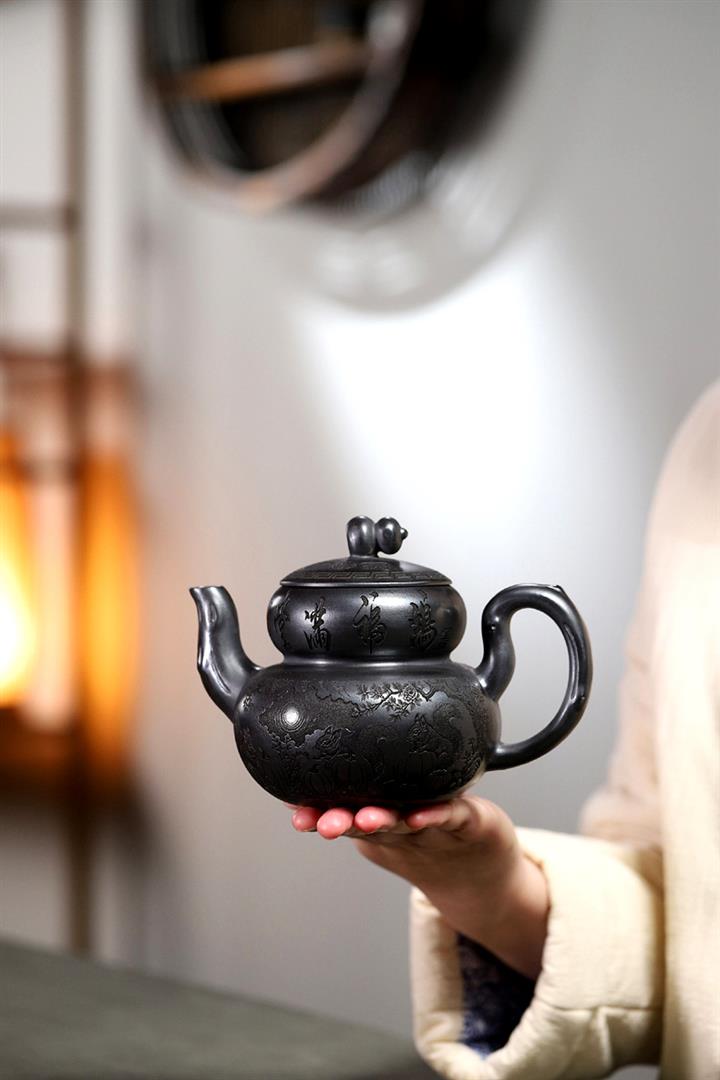 原礦清灰段泥梅花刻繪匏瓜壺POT7404