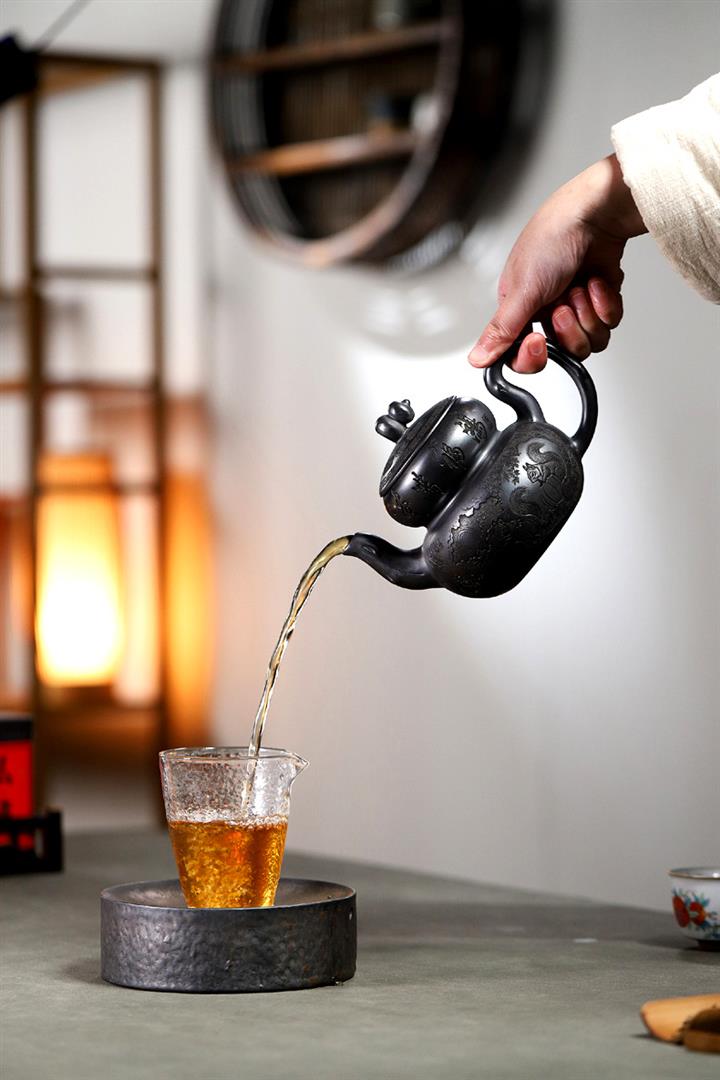 【泥料特點】砂土氣重,似淳實農民,日久使用,漸露鋒芒,養成變化,溫潤莊重。紫砂是壹種雙重氣孔結構的多孔性材質,氣孔微細,密度高。用紫砂壺沏茶,不失原味,且香不渙散,得茶之真香真味。紫砂使用越久,壺身色澤越發光亮照人,氣韻溫雅。紫砂壺長久使用器身會因撫摸擦拭,變得越發溫潤光澤。