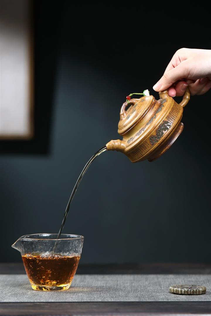 【泥料特點】砂土氣重,似淳實農民,日久使用,漸露鋒芒,養成變化,溫潤莊重。紫砂是壹種雙重氣孔結構的多孔性材質,氣孔微細,密度高。用紫砂壺沏茶,不失原味,且香不渙散,得茶之真香真味。紫砂使用越久,壺身色澤越發光亮照人,氣韻溫雅。紫砂壺長久使用器身會因撫摸擦拭,變得越發溫潤光澤。