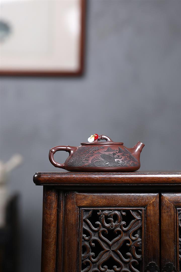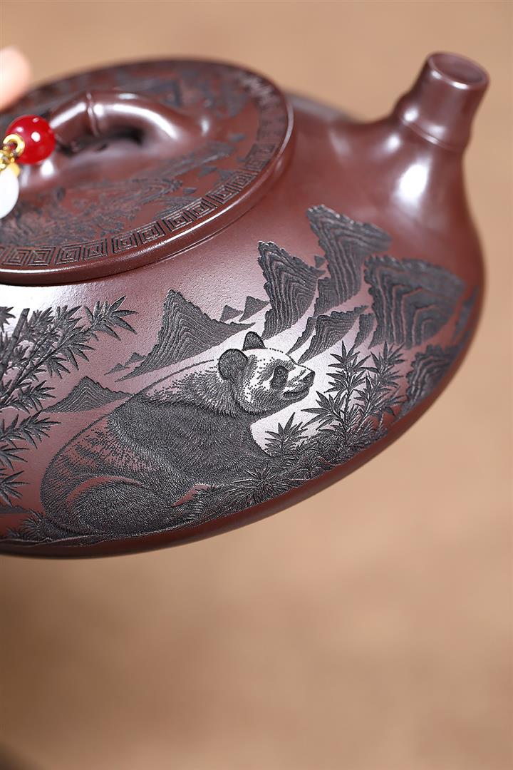 240cc原礦石紅刻繪熊貓竹瓢泡茶壺POT9161