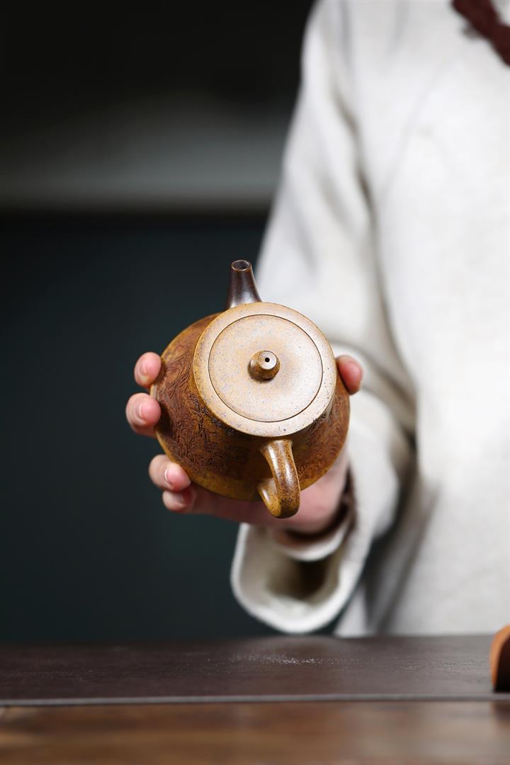 【泥料特點】砂土氣重,似淳實農民,日久使用,漸露鋒芒,養成變化,溫潤莊重。紫砂是壹種雙重氣孔結構的多孔性材質,氣孔微細,密度高。用紫砂壺沏茶,不失原味,且香不渙散,得茶之真香真味。紫砂使用越久,壺身色澤越發光亮照人,氣韻溫雅。紫砂壺長久使用器身會因撫摸擦拭,變得越發溫潤光澤。