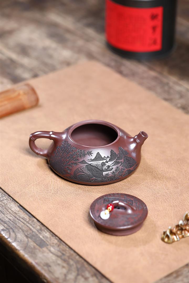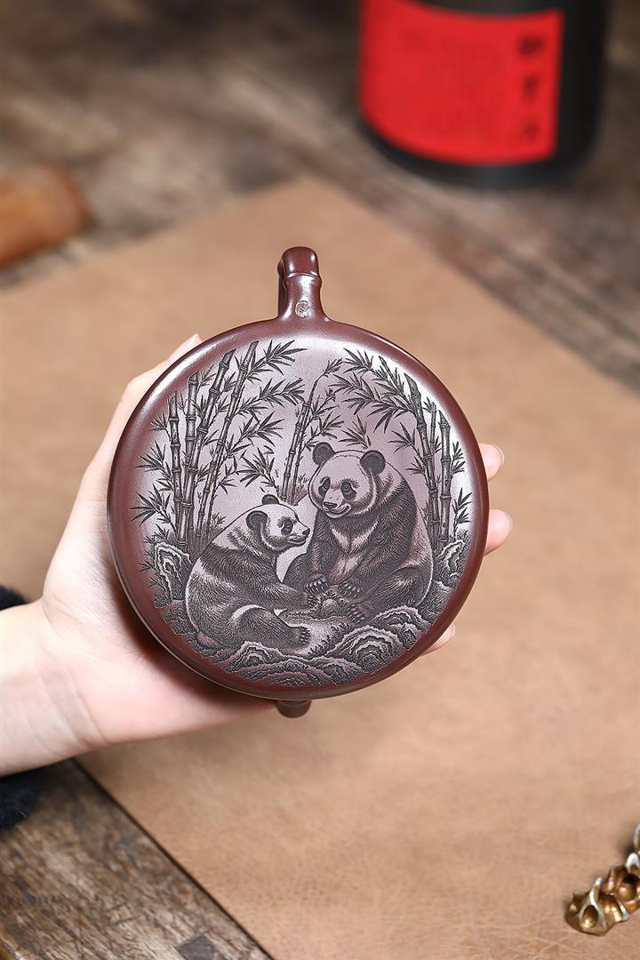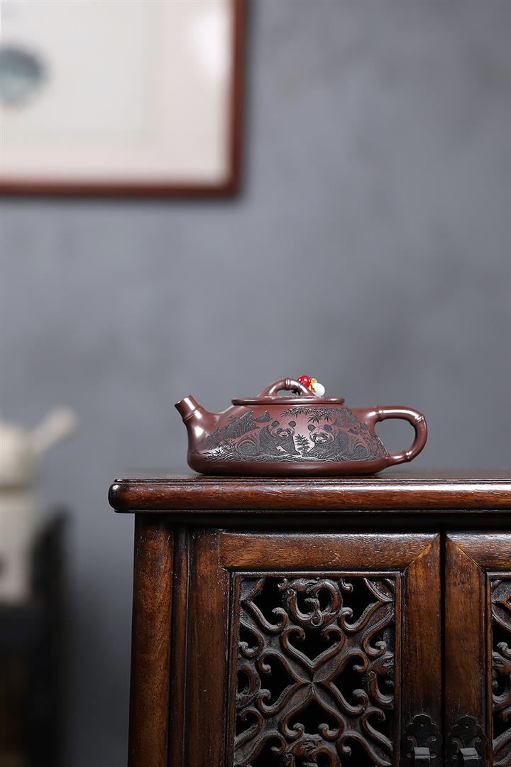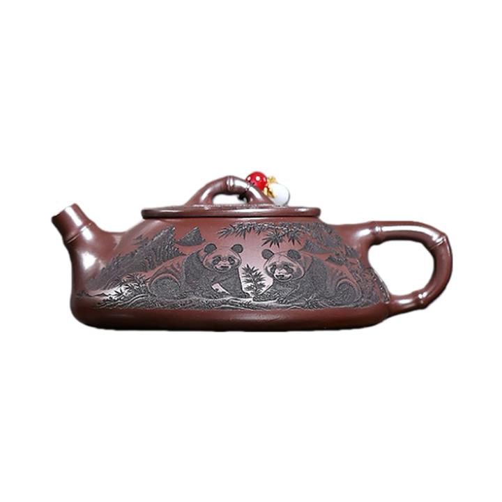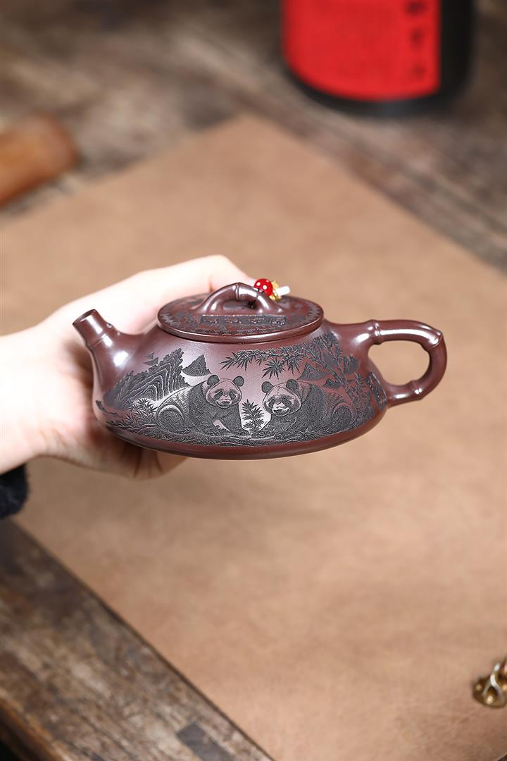 240cc原礦石紅刻繪熊貓竹瓢茶壺POT9276