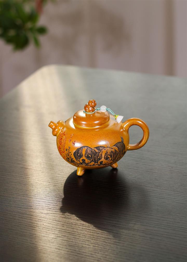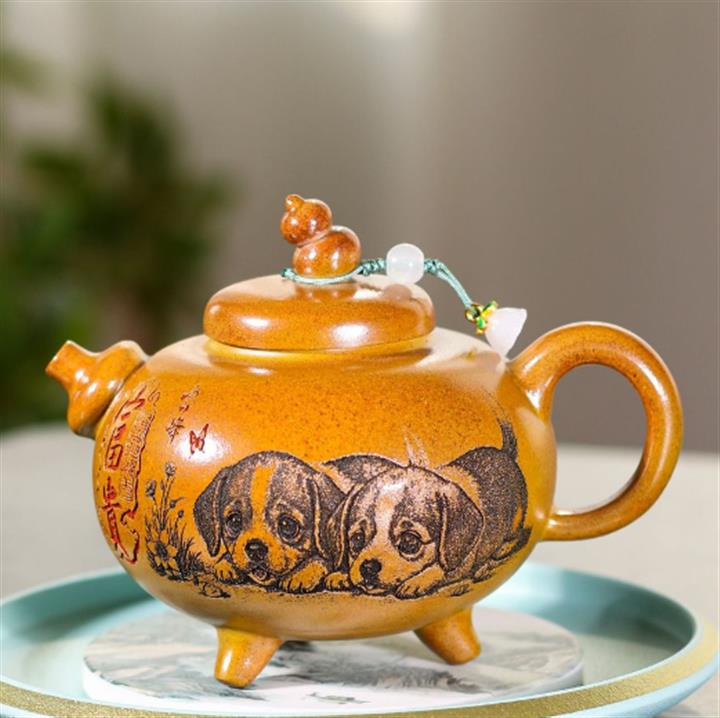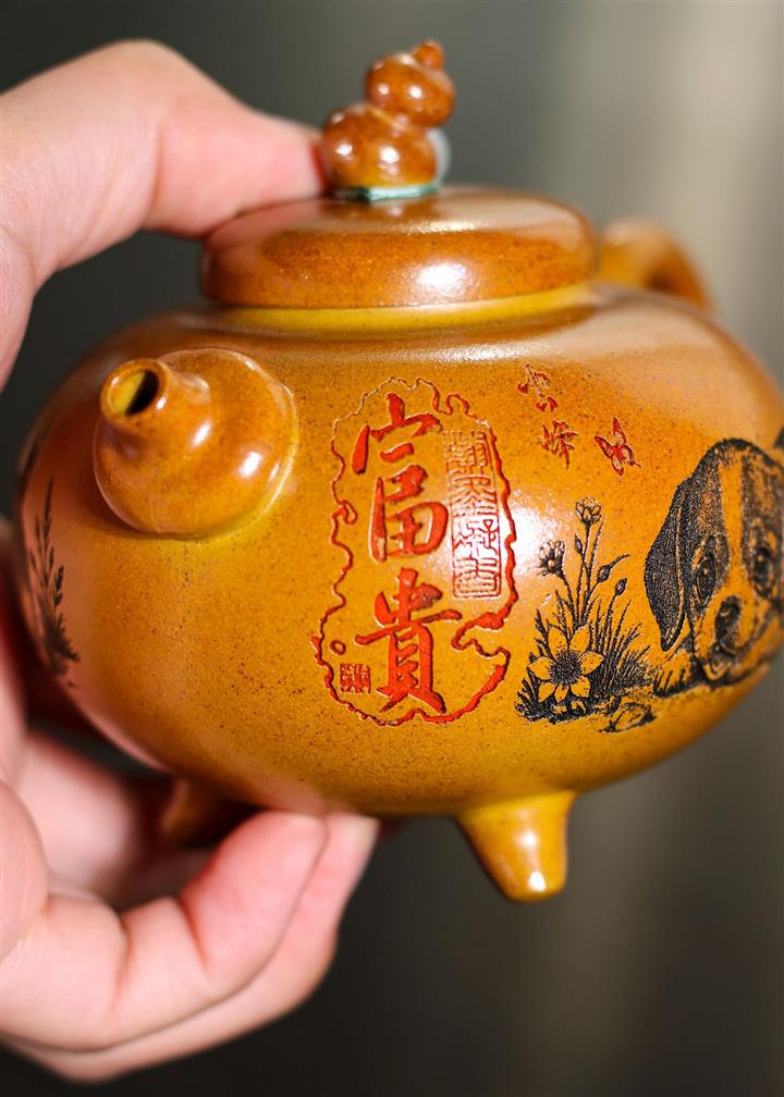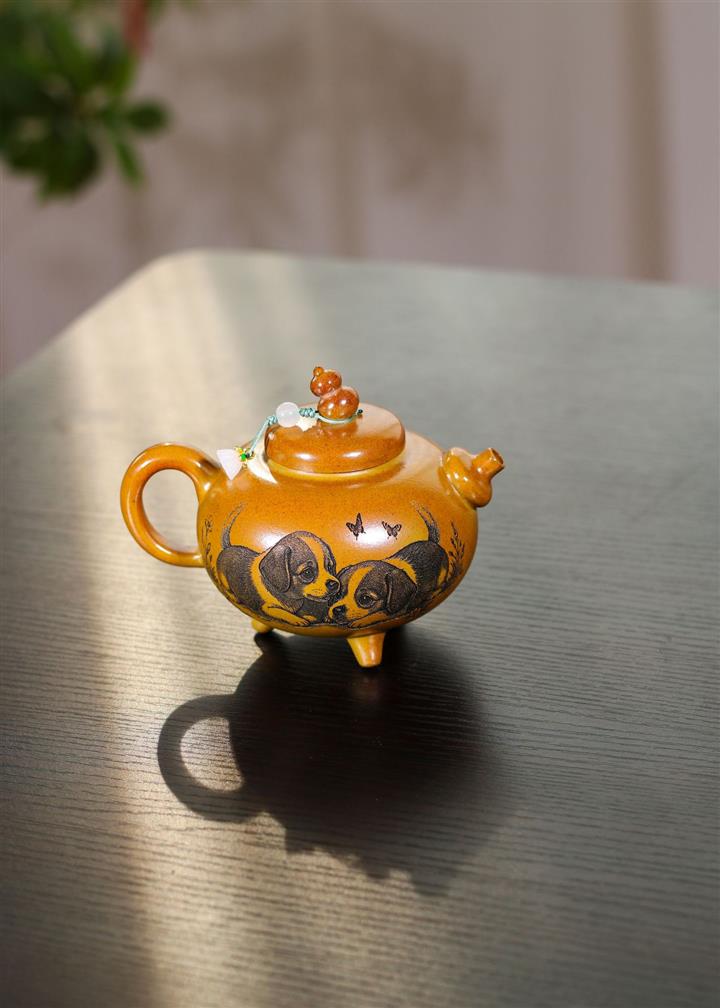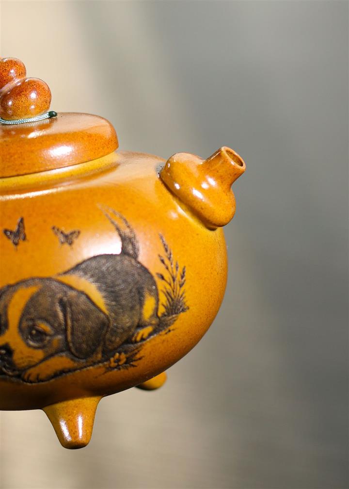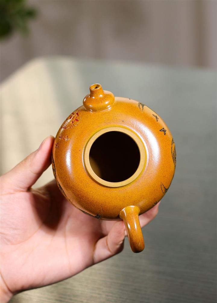 原礦石黃刻繪觀山汲直茶壺POT6981