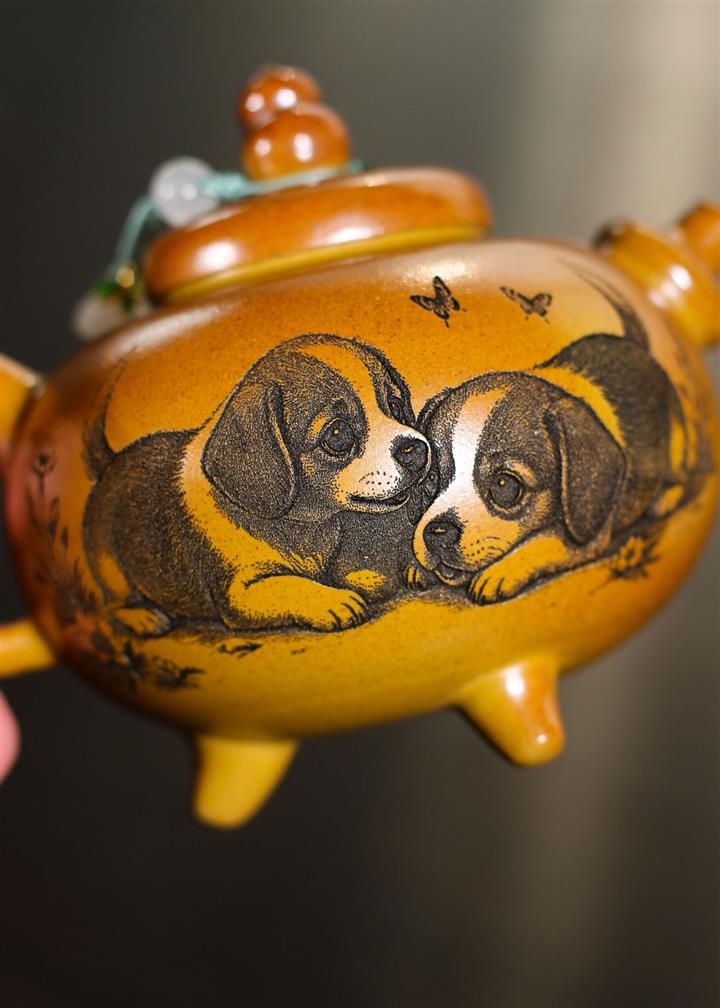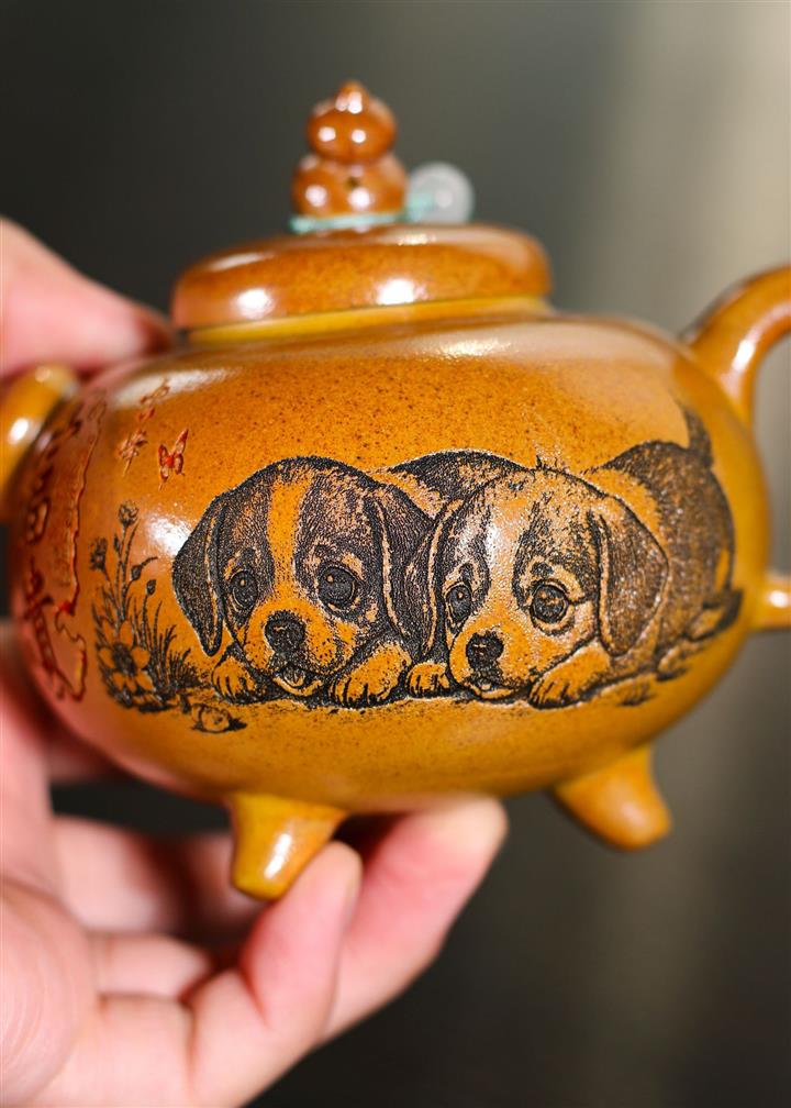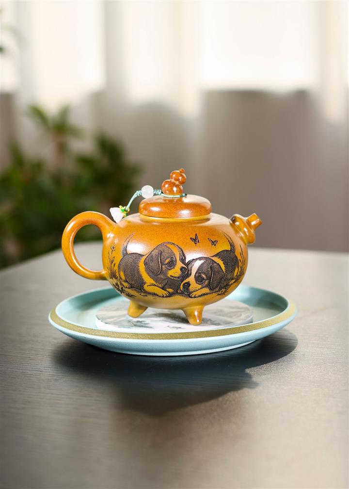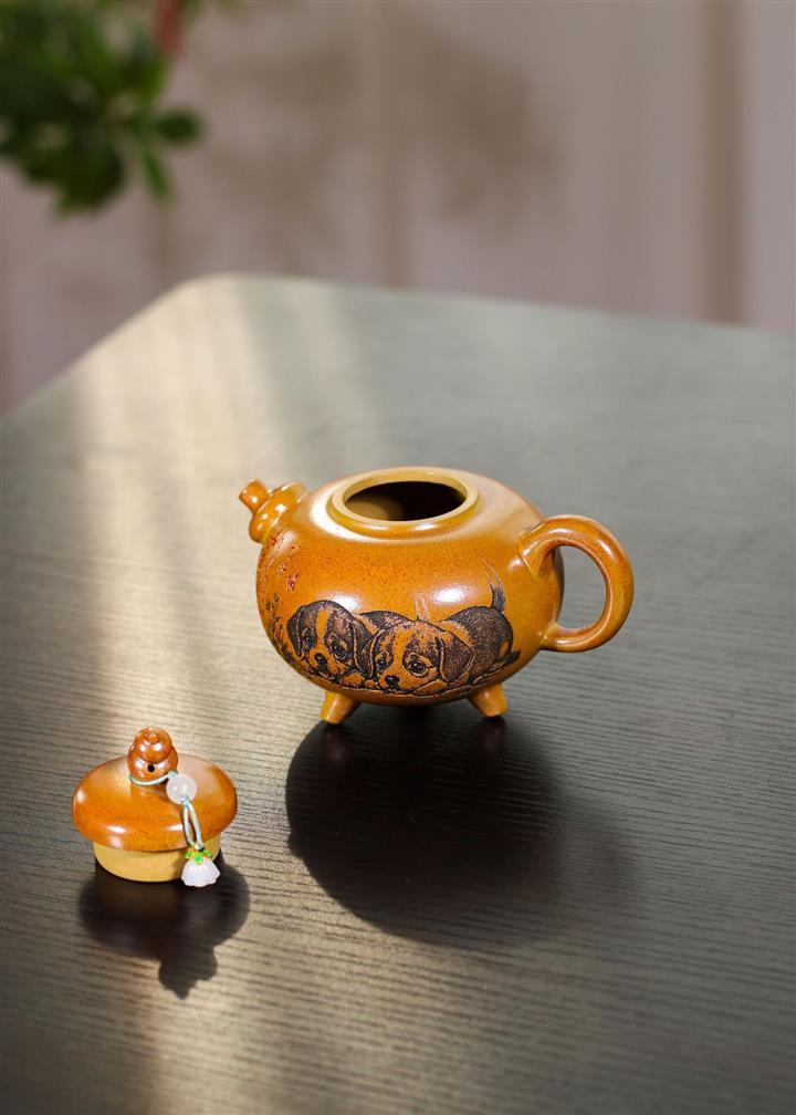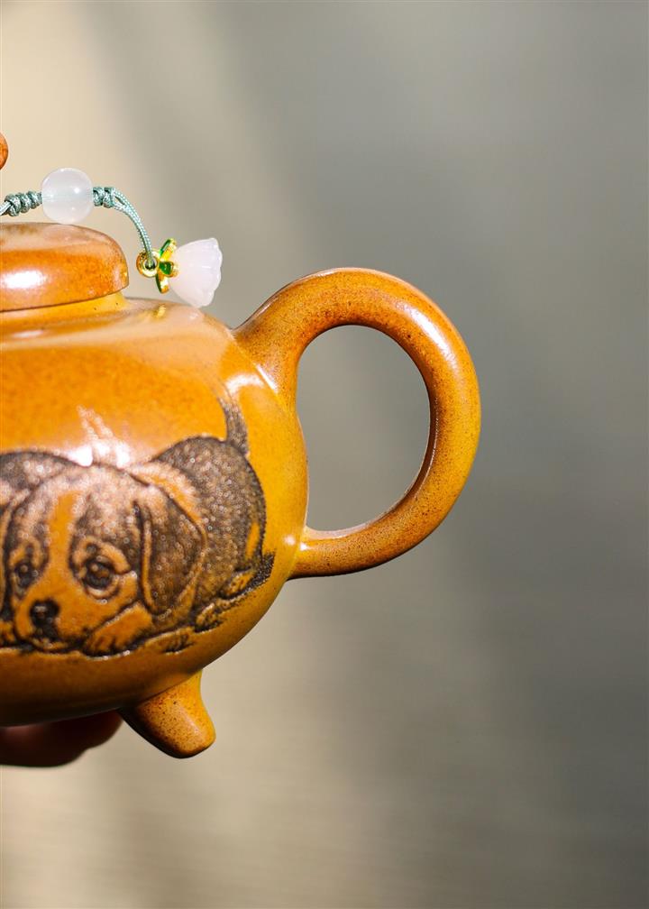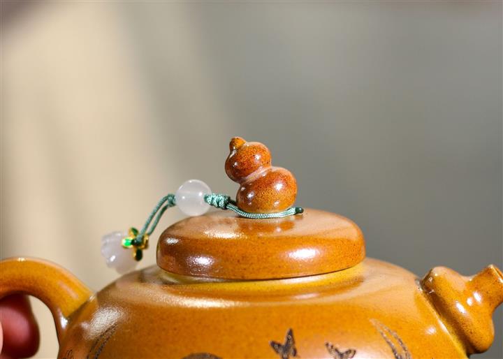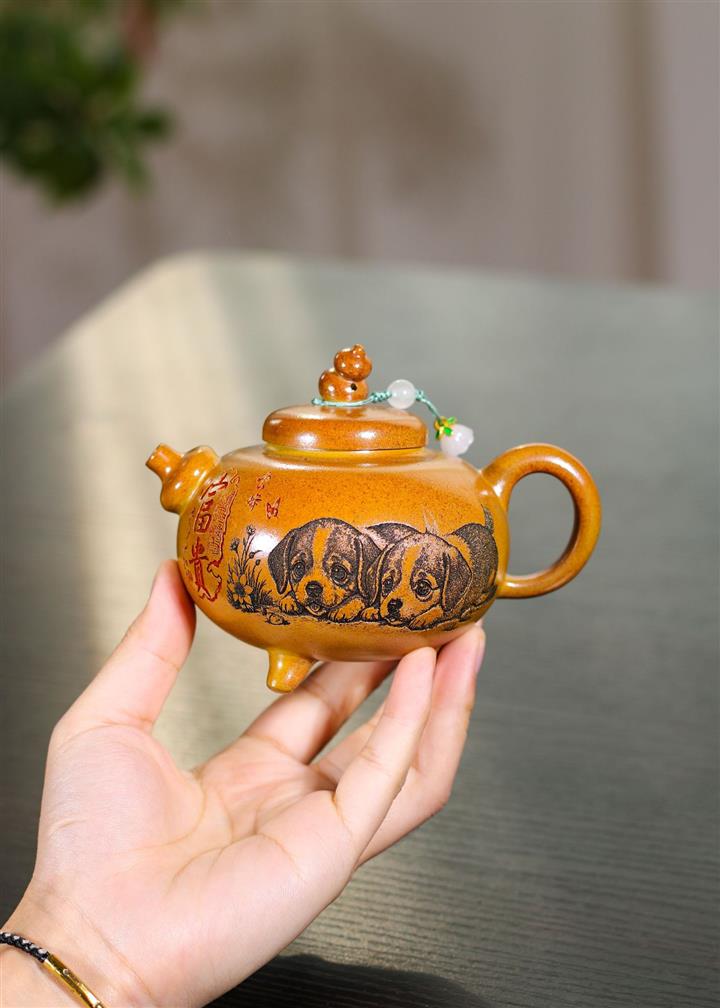 原礦石黃刻繪觀山汲直茶壺POT6981