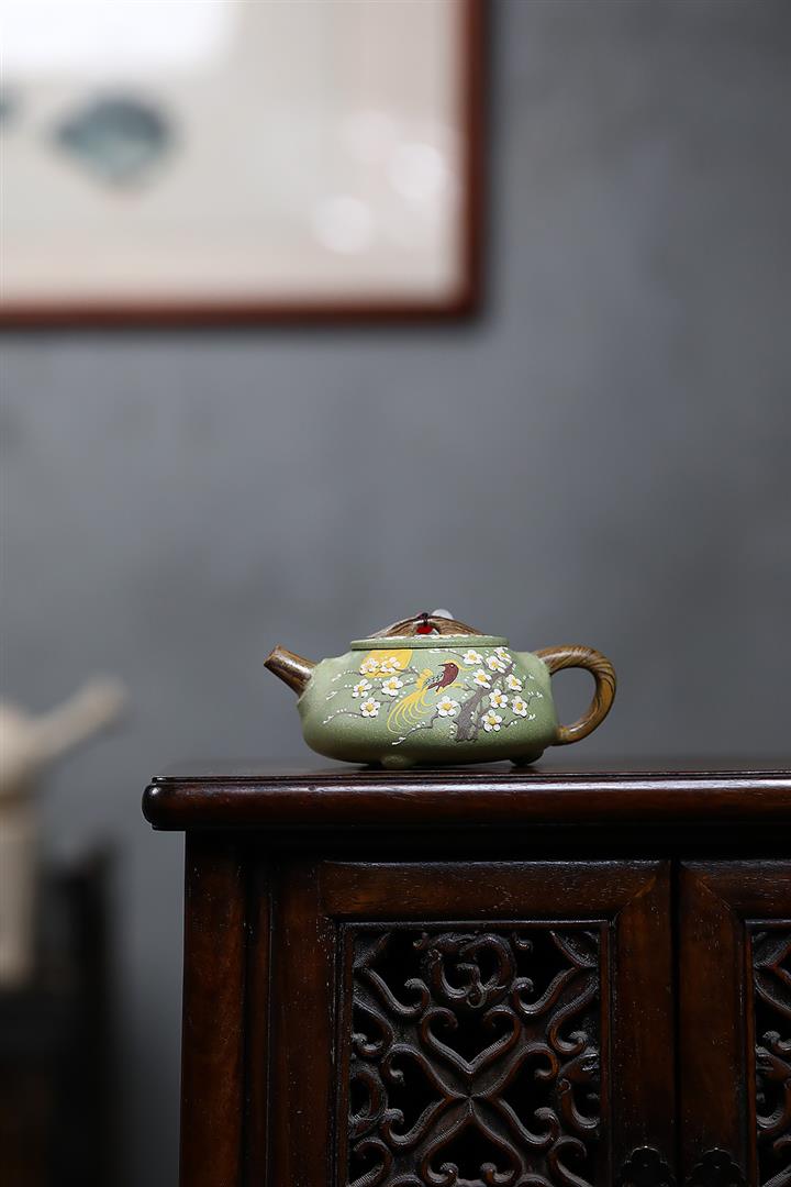 200cc原礦豆青砂絞泥喜上梅梢泡茶壺POT9479