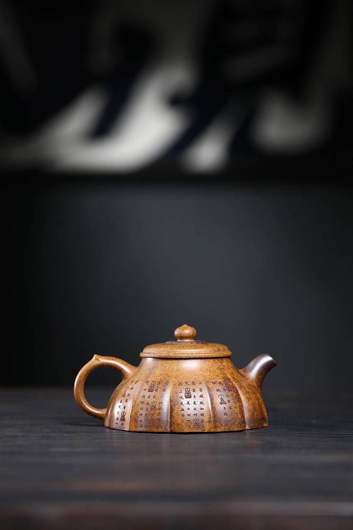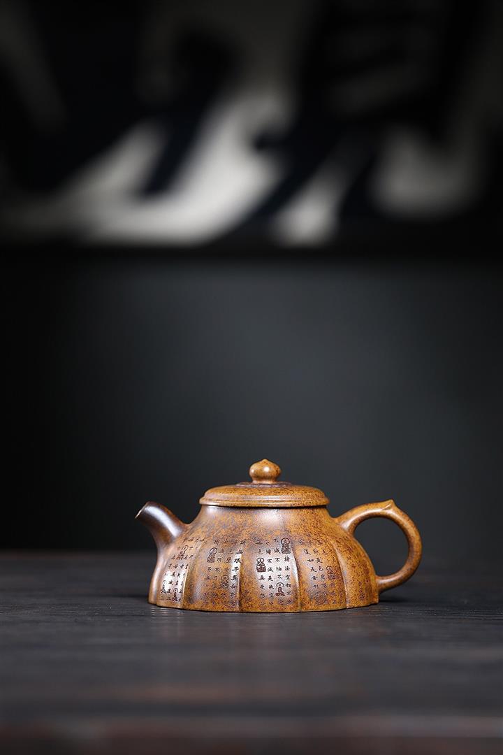 300cc原礦黑料六方金鐘滿彩刻長城泡茶壺POT9517