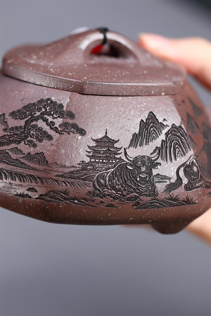 竹段原礦龍骨金砂手刻字畫紫砂壺工堂禮品茶具壺pot3787