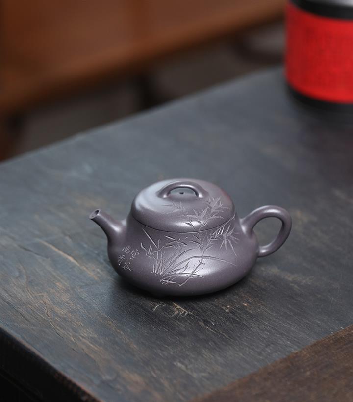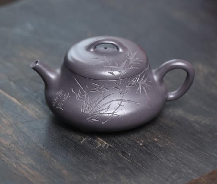 原礦朱泥紫砂壺手工刻繪扁瓢壺POT4043