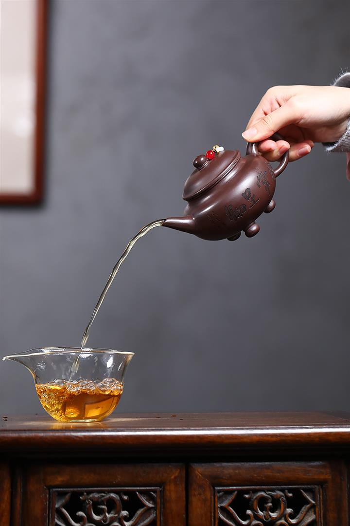 【泥料特點】砂土氣重,似淳實農民,日久使用,漸露鋒芒,養成變化,溫潤莊重。紫砂是壹種雙重氣孔結構的多孔性材質,氣孔微細,密度高。用紫砂壺沏茶,不失原味,且香不渙散,得茶之真香真味。紫砂使用越久,壺身色澤越發光亮照人,氣韻溫雅。紫砂壺長久使用器身會因撫摸擦拭,變得越發溫潤光澤。