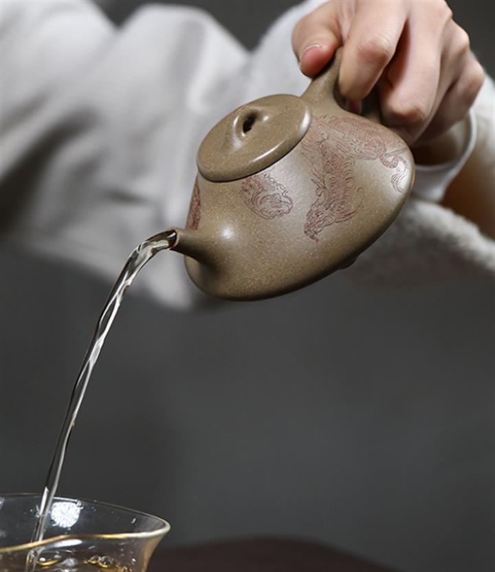 【泥料特點】砂土氣重,似淳實農民,日久使用,漸露鋒芒,養成變化,溫潤莊重。紫砂是壹種雙重氣孔結構的多孔性材質,氣孔微細,密度高。用紫砂壺沏茶,不失原味,且香不渙散,得茶之真香真味。紫砂使用越久,壺身色澤越發光亮照人,氣韻溫雅。紫砂壺長久使用器身會因撫摸擦拭,變得越發溫潤光澤。