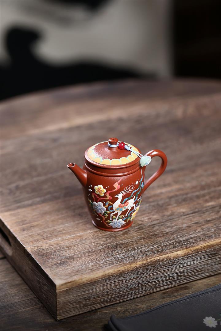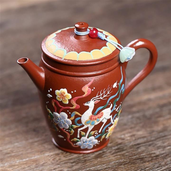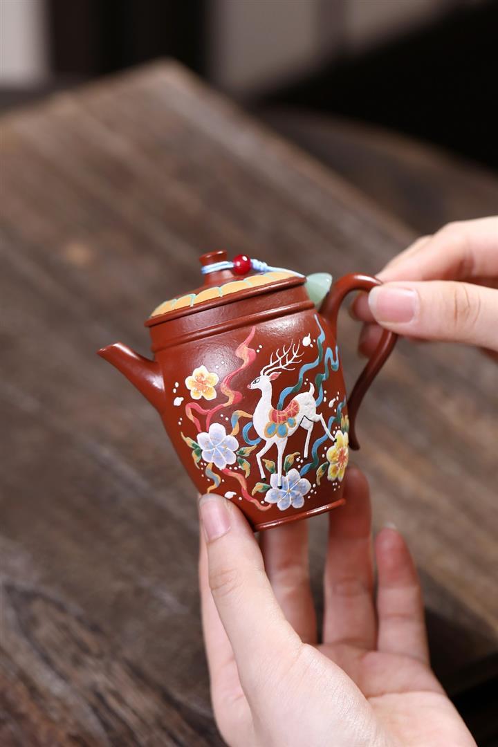 110cc原礦粗砂朱泥泥繪神鹿竹筒茶壺POT8086