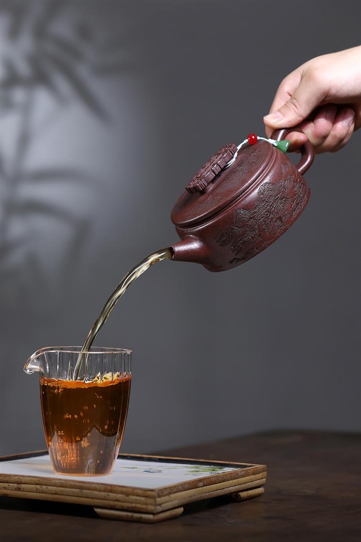 320cc原礦石紅泥滿刻桃源西施茶壺POT8404