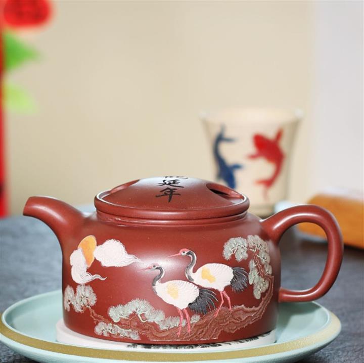 300cc大紅袍堆繪松鶴延年牛蓋蓮子茶壺POT8190