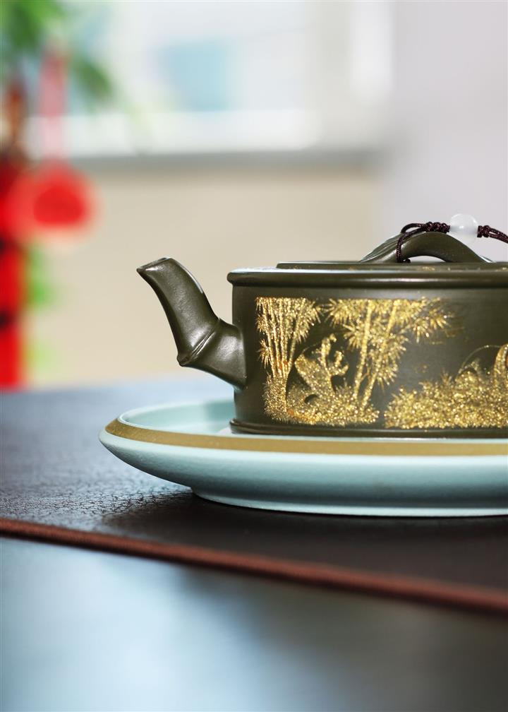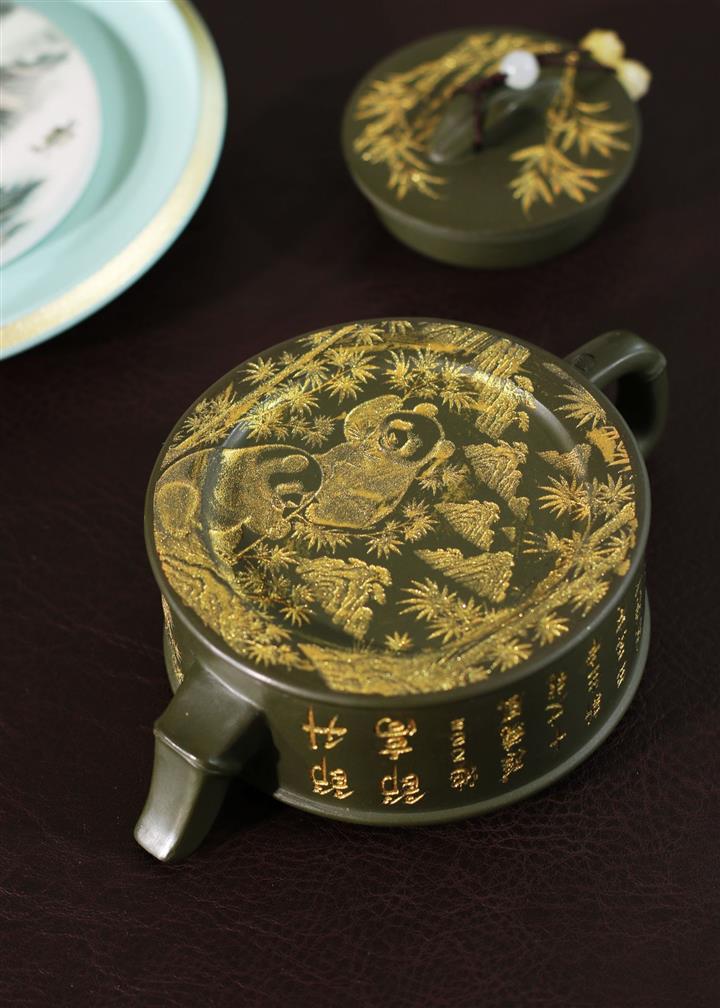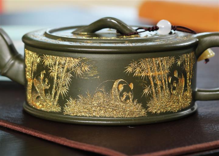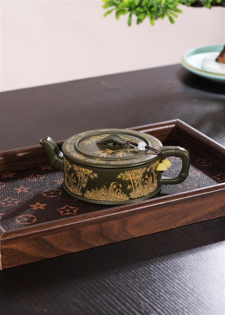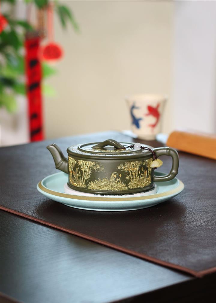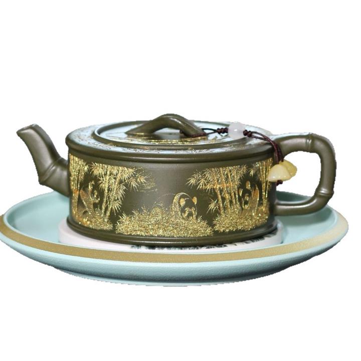 190cc原礦綠泥虛扁熊貓竹段茶壺POT8207