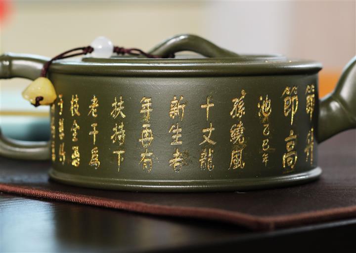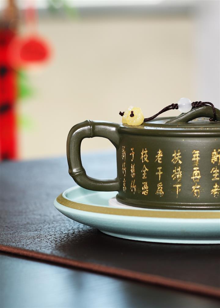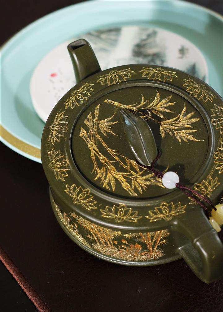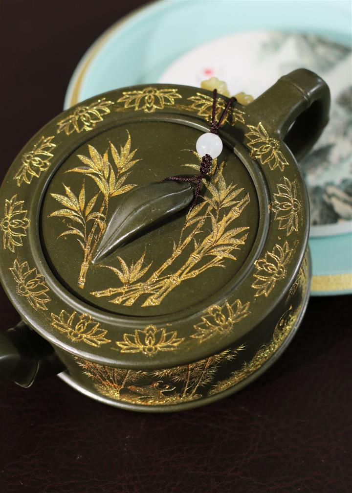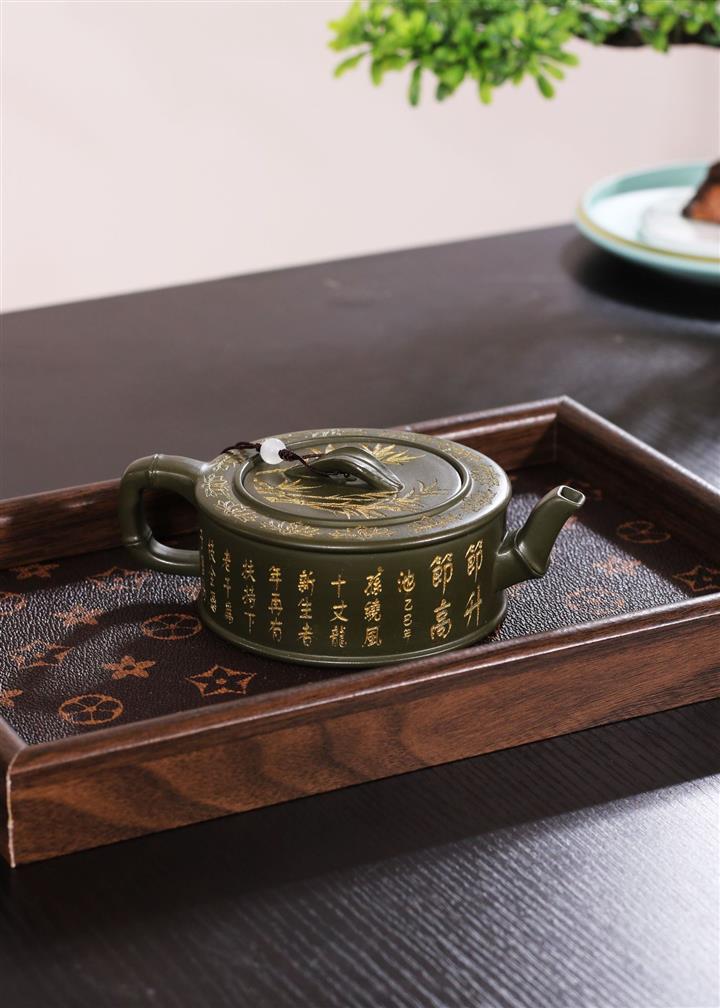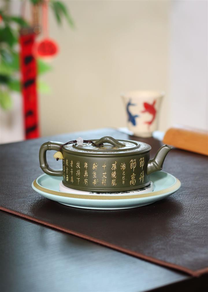 190cc原礦綠泥虛扁熊貓竹段茶壺POT8207