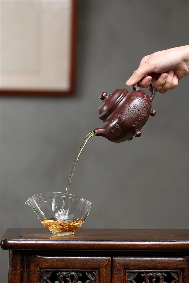 【泥料特點】砂土氣重,似淳實農民,日久使用,漸露鋒芒,養成變化,溫潤莊重。紫砂是壹種雙重氣孔結構的多孔性材質,氣孔微細,密度高。用紫砂壺沏茶,不失原味,且香不渙散,得茶之真香真味。紫砂使用越久,壺身色澤越發光亮照人,氣韻溫雅。紫砂壺長久使用器身會因撫摸擦拭,變得越發溫潤光澤。