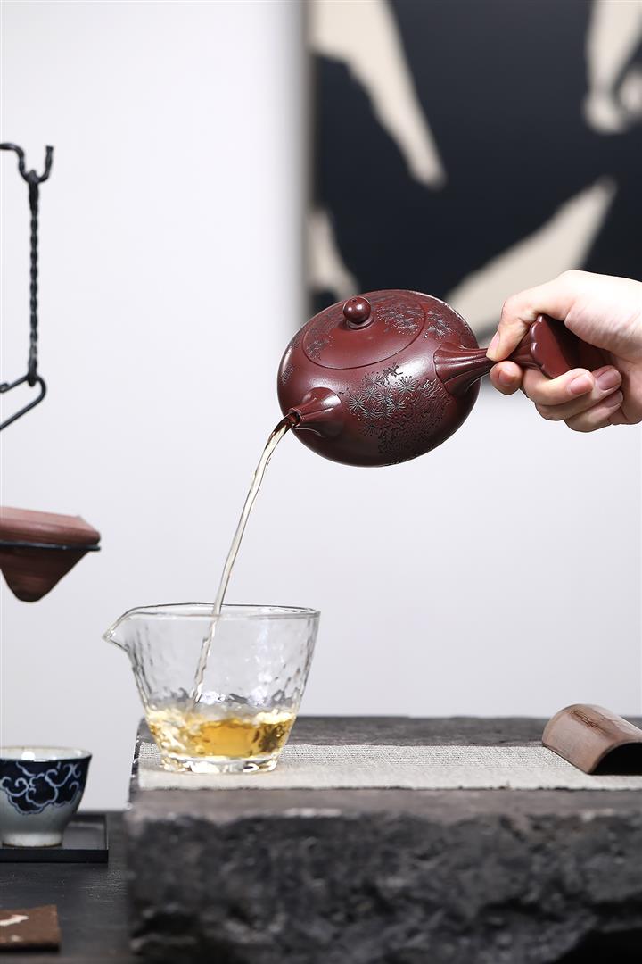 【泥料特點】砂土氣重,似淳實農民,日久使用,漸露鋒芒,養成變化,溫潤莊重。紫砂是壹種雙重氣孔結構的多孔性材質,氣孔微細,密度高。用紫砂壺沏茶,不失原味,且香不渙散,得茶之真香真味。紫砂使用越久,壺身色澤越發光亮照人,氣韻溫雅。紫砂壺長久使用器身會因撫摸擦拭,變得越發溫潤光澤。