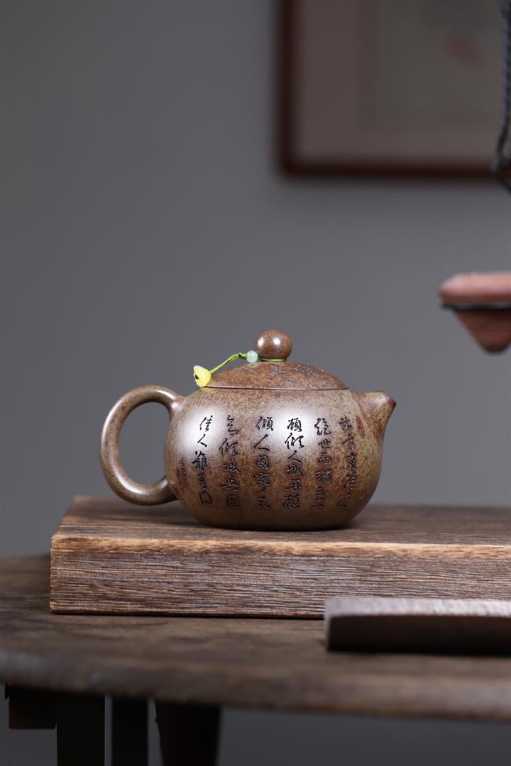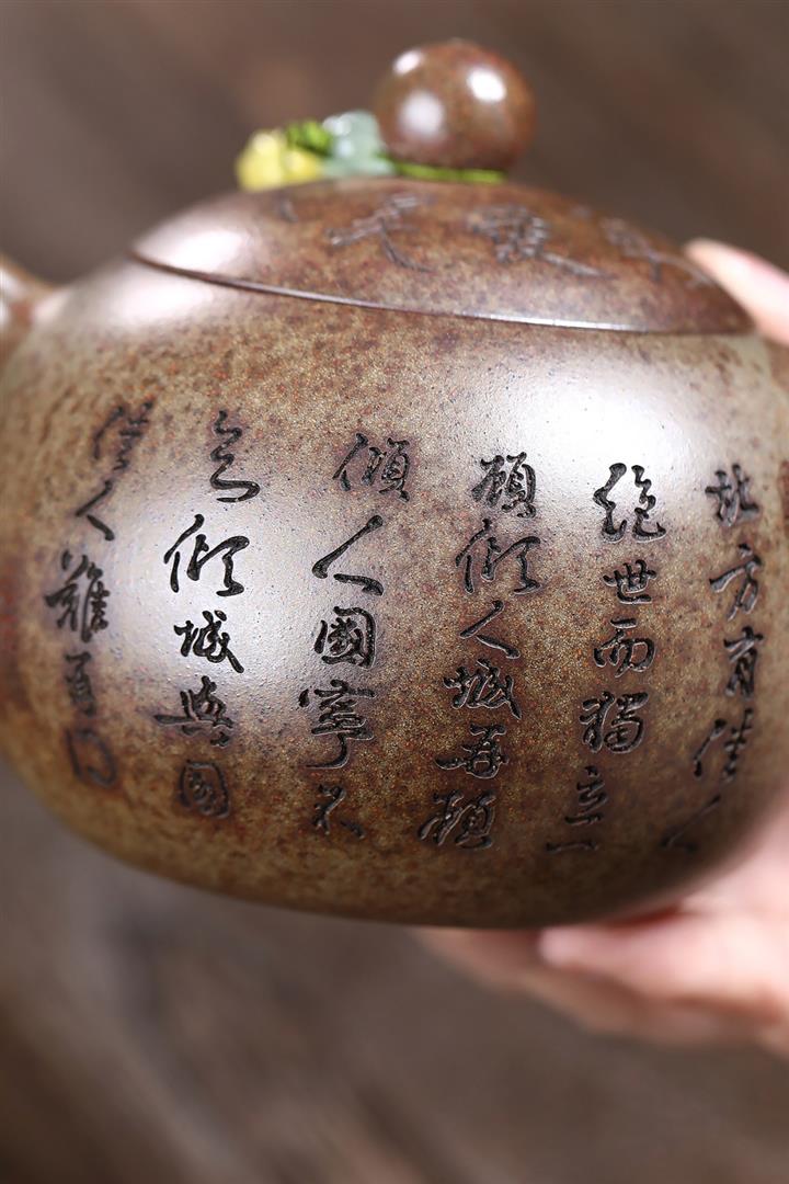 原礦紫泥純手工刻繪子冶石瓢茶壺POT6928