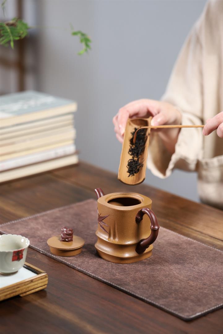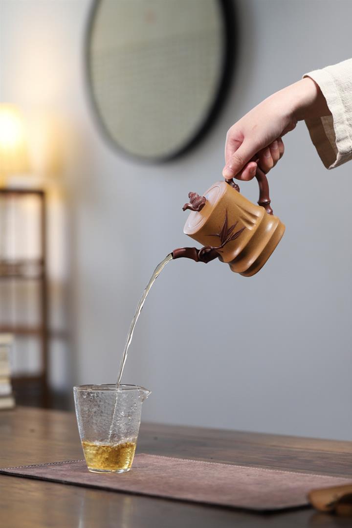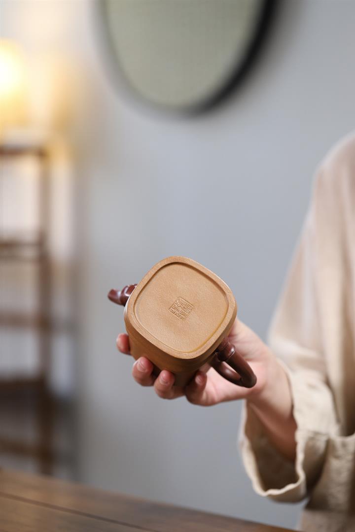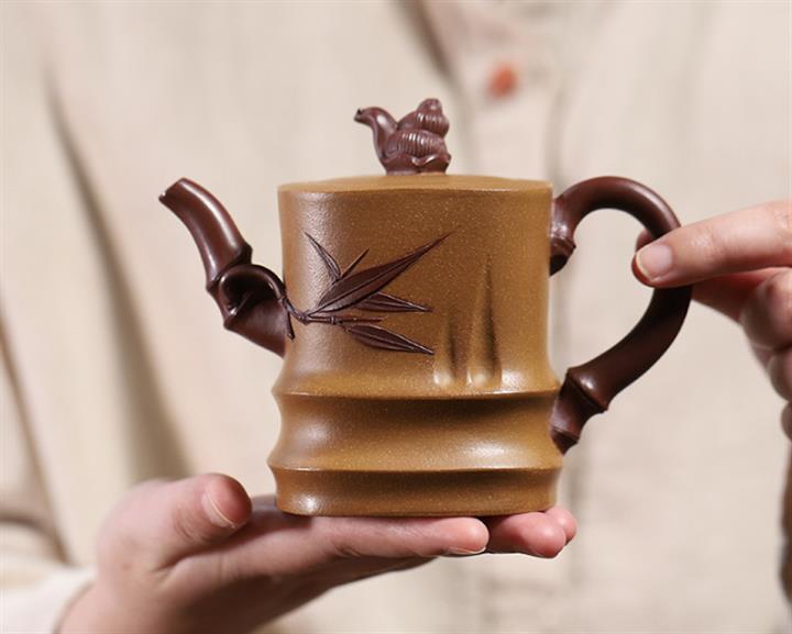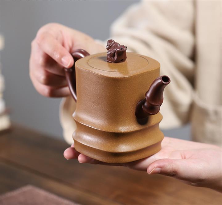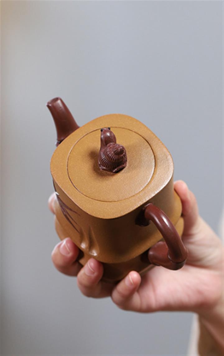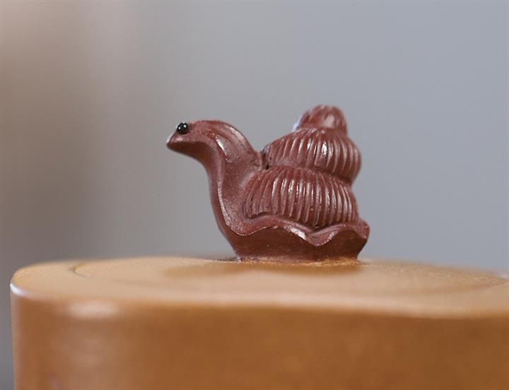 【泥料特點】砂土氣重,似淳實農民,日久使用,漸露鋒芒,養成變化,溫潤莊重。紫砂是壹種雙重氣孔結構的多孔性材質,氣孔微細,密度高。用紫砂壺沏茶,不失原味,且香不渙散,得茶之真香真味。紫砂使用越久,壺身色澤越發光亮照人,氣韻溫雅。紫砂壺長久使用器身會因撫摸擦拭,變得越發溫潤光澤。