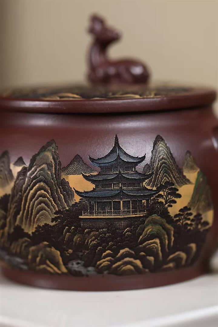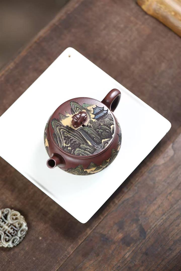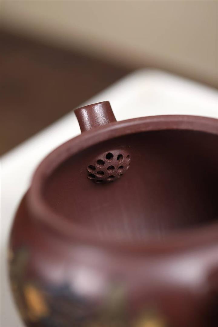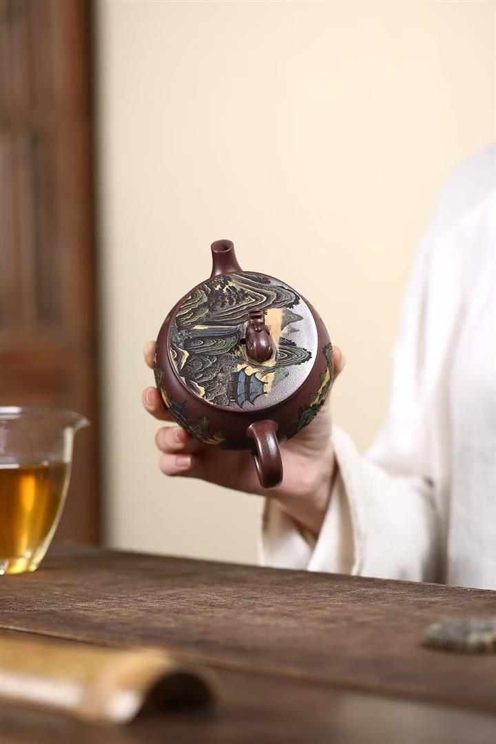 全純手工刻繪原礦紫砂線圓壺POT3928