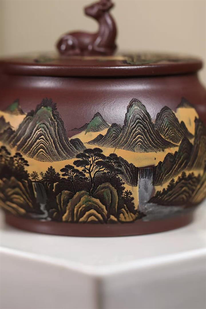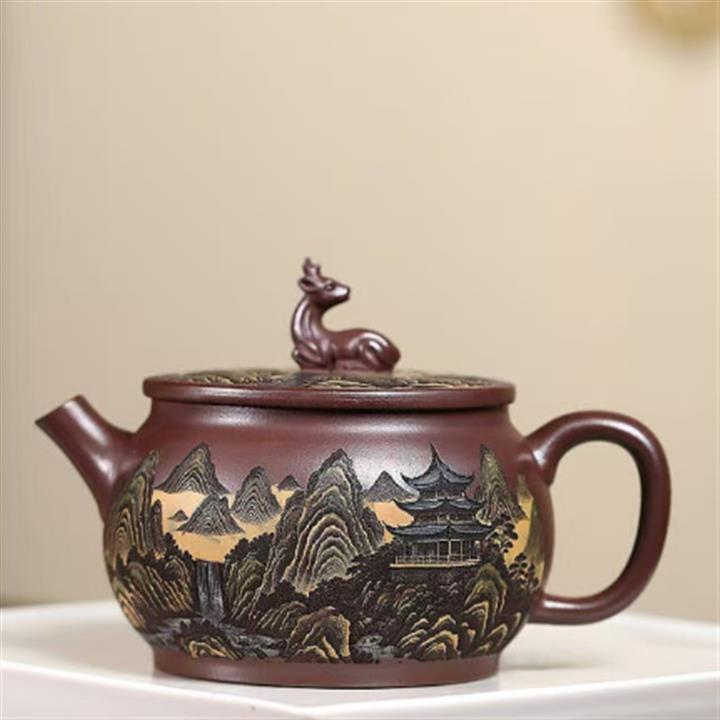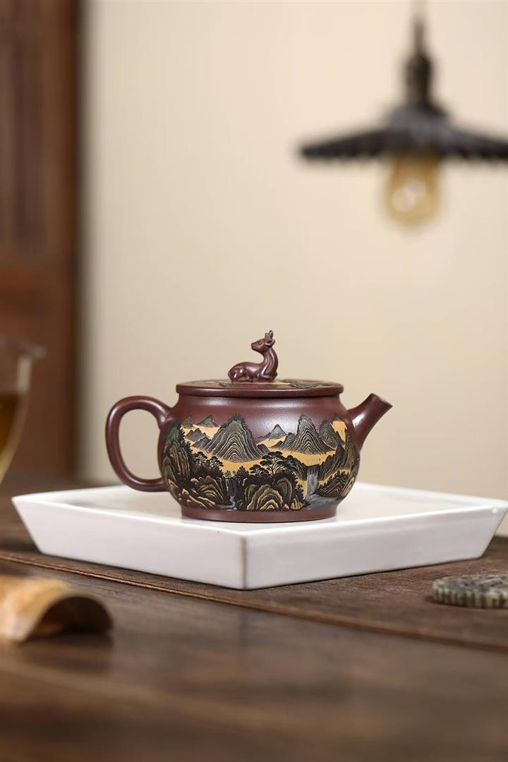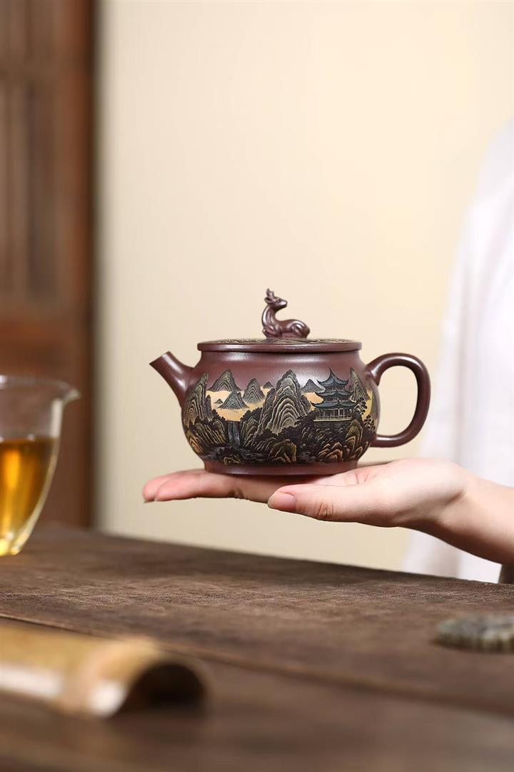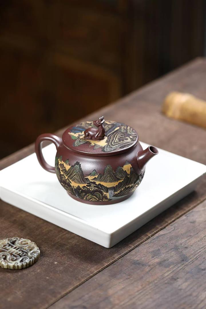全純手工刻繪原礦紫砂線圓壺POT3928