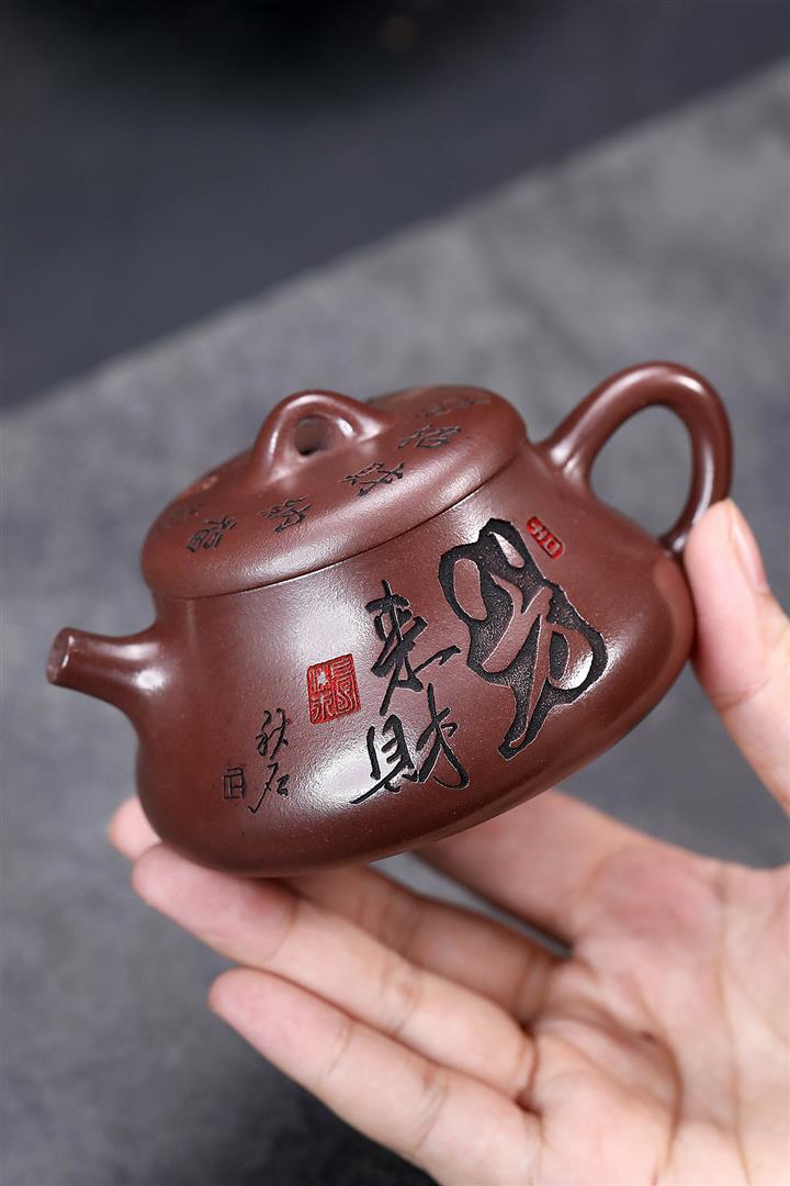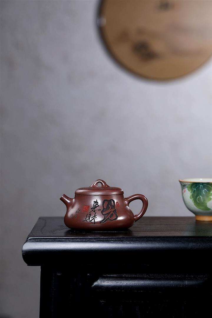 原礦朱泥紫砂壺手工刻繪扁瓢壺POT4043