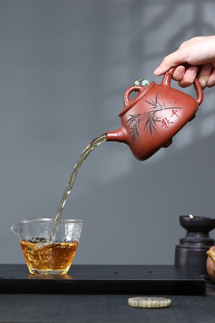 【泥料特點】砂土氣重,似淳實農民,日久使用,漸露鋒芒,養成變化,溫潤莊重。紫砂是壹種雙重氣孔結構的多孔性材質,氣孔微細,密度高。用紫砂壺沏茶,不失原味,且香不渙散,得茶之真香真味。紫砂使用越久,壺身色澤越發光亮照人,氣韻溫雅。紫砂壺長久使用器身會因撫摸擦拭,變得越發溫潤光澤。