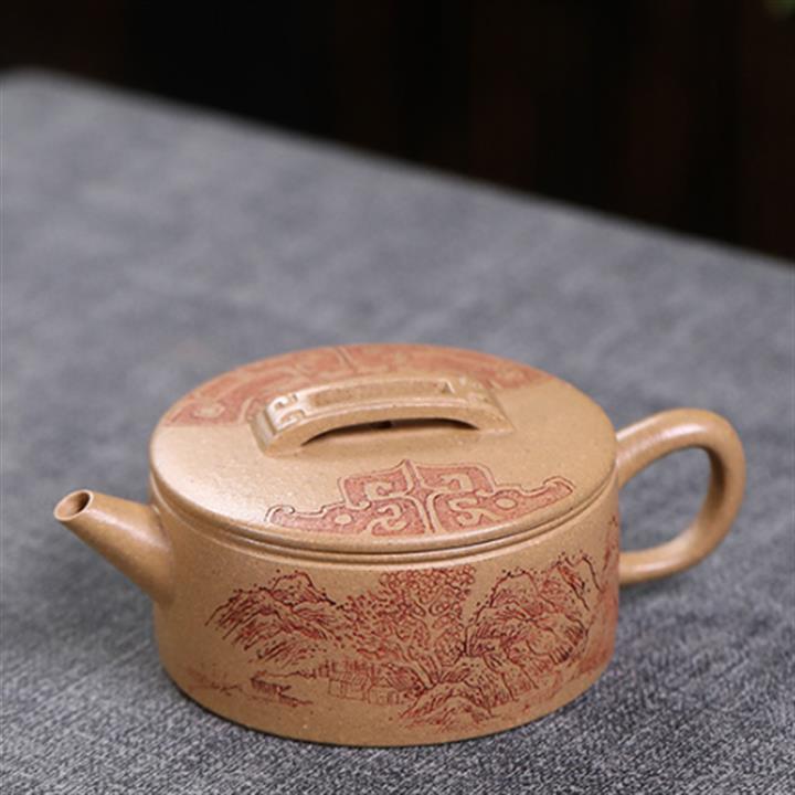 200cc原礦石黃滿身刻繪虛扁扁晨茶壺POT8274