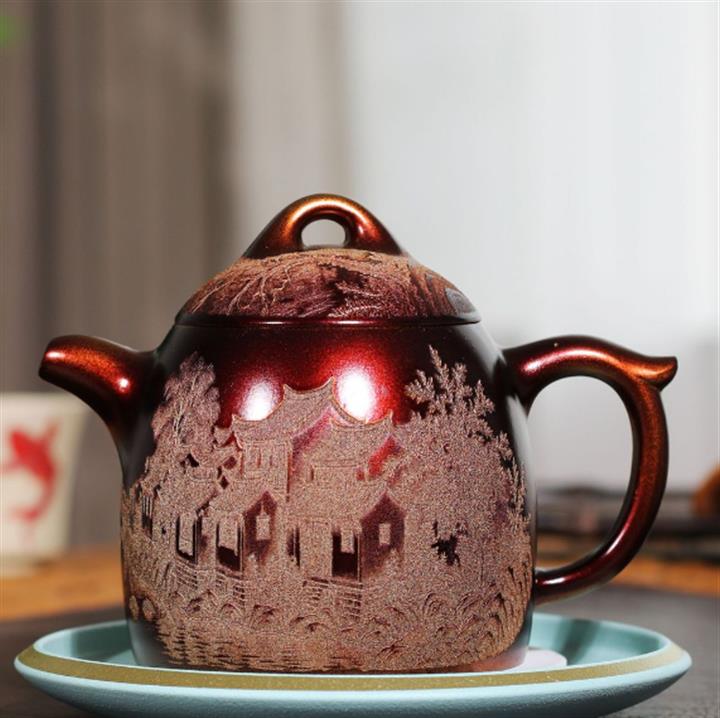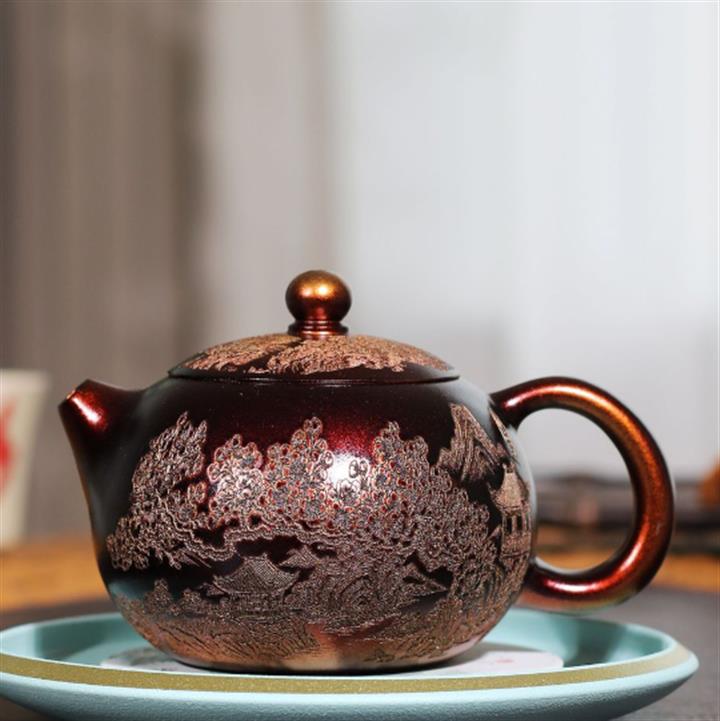 300cc原礦高溫段泥刻繪觀山虛扁茶壺POT8210