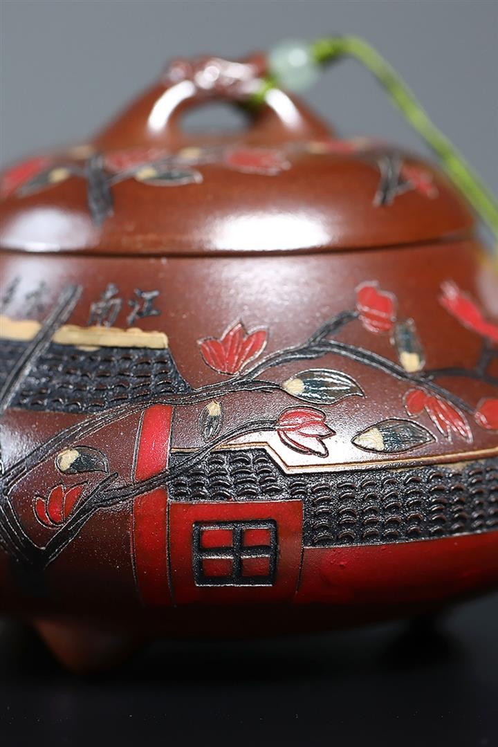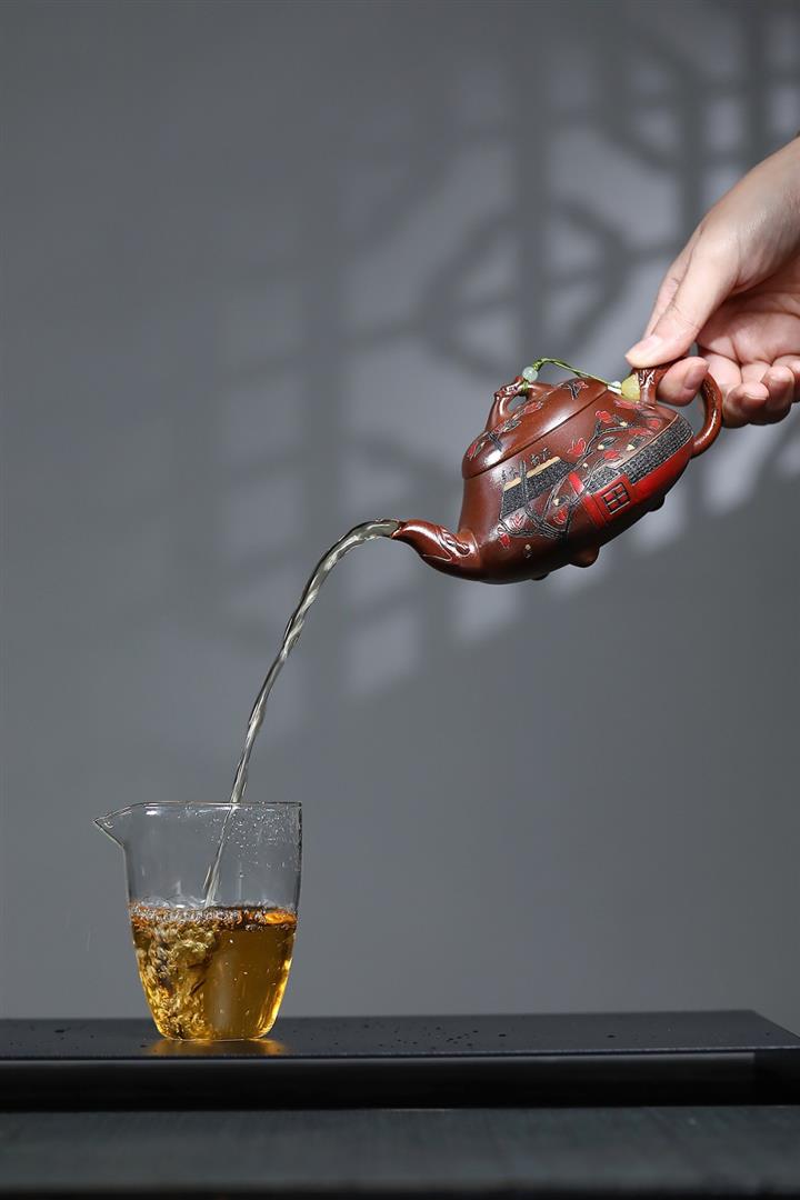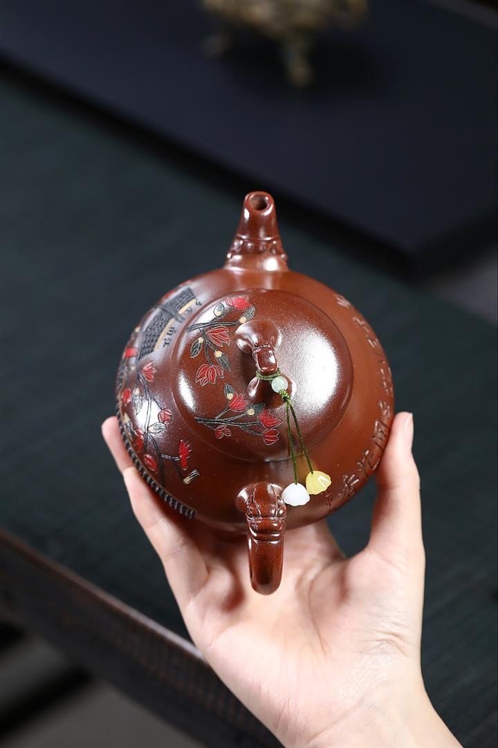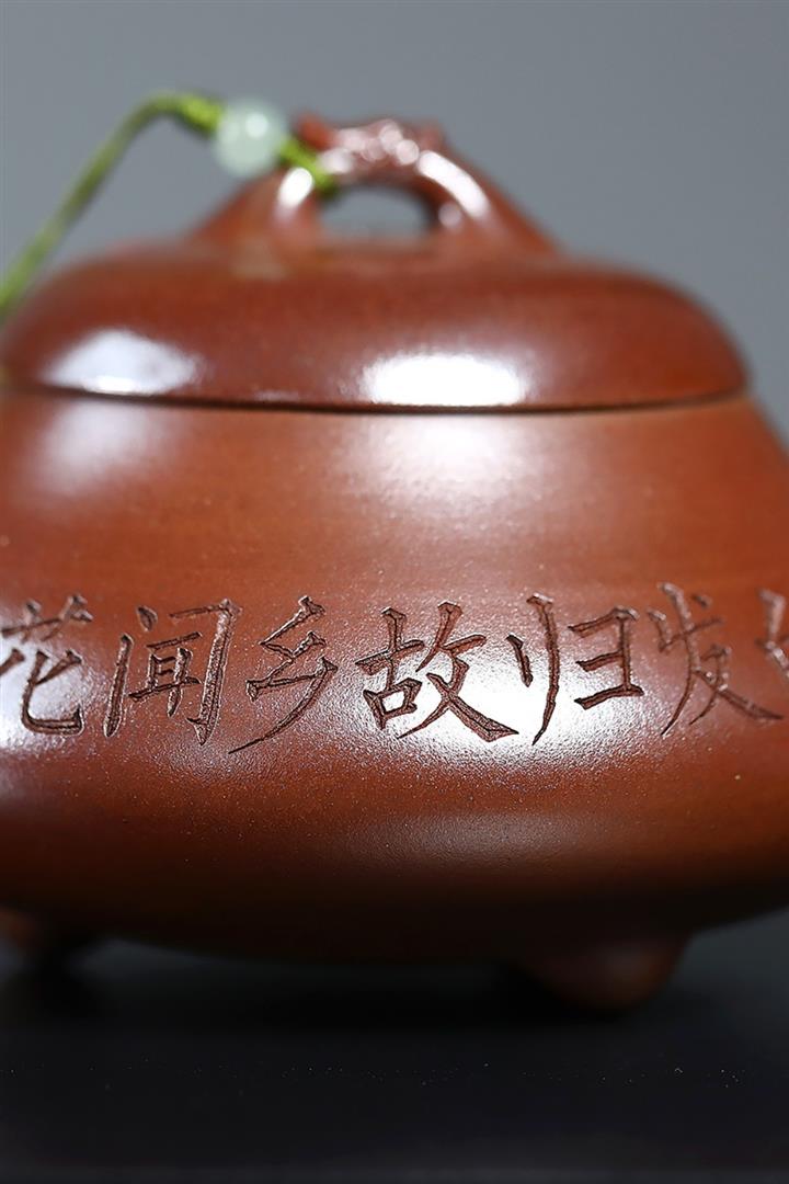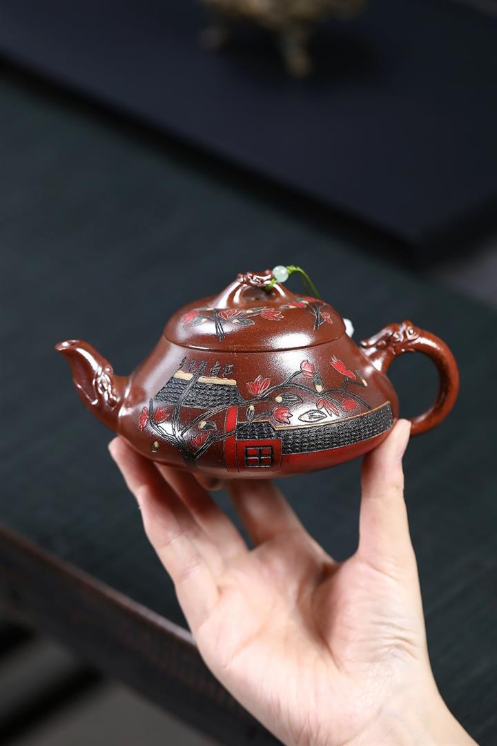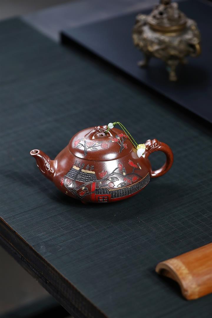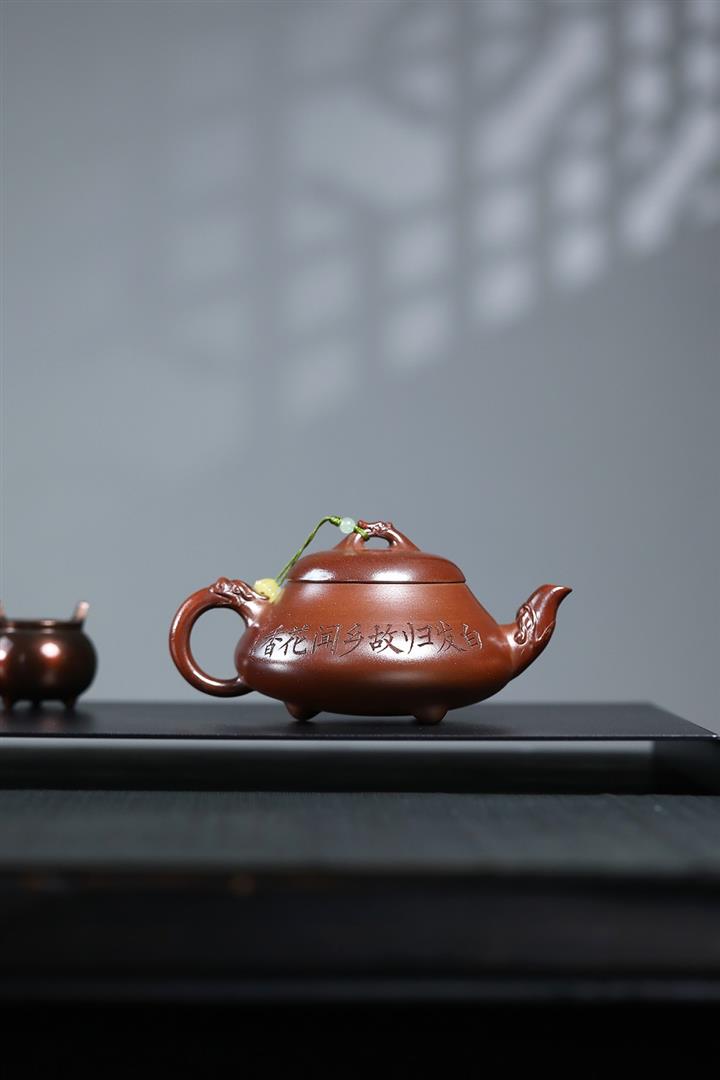【泥料特點】砂土氣重,似淳實農民,日久使用,漸露鋒芒,養成變化,溫潤莊重。紫砂是壹種雙重氣孔結構的多孔性材質,氣孔微細,密度高。用紫砂壺沏茶,不失原味,且香不渙散,得茶之真香真味。紫砂使用越久,壺身色澤越發光亮照人,氣韻溫雅。紫砂壺長久使用器身會因撫摸擦拭,變得越發溫潤光澤。
