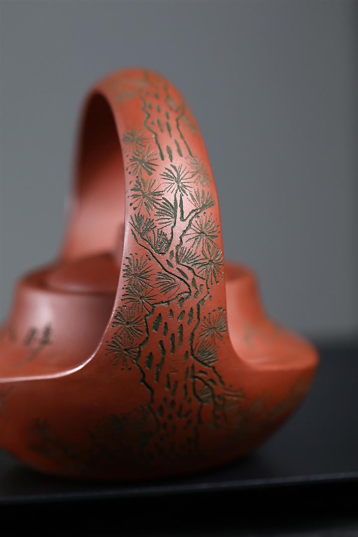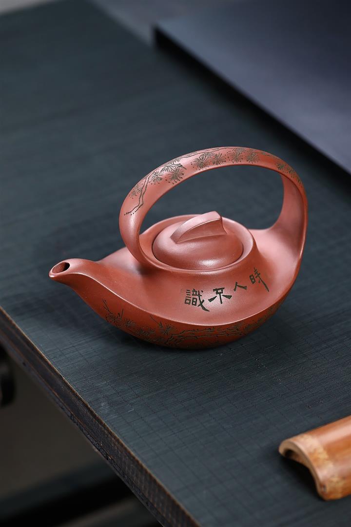 400cc原礦清水泥陶刻松影曲梁提梁茶壺POT8753