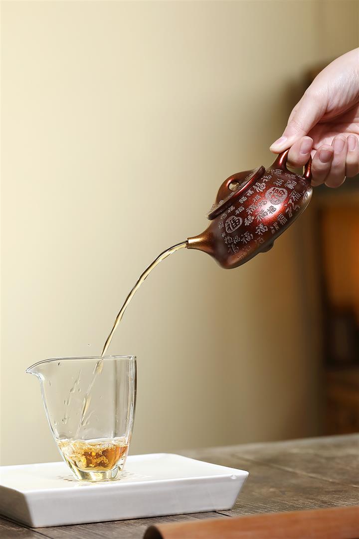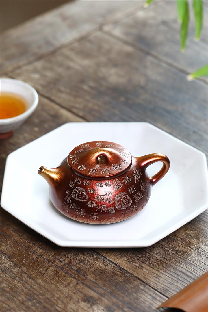 【泥料特點】砂土氣重,似淳實農民,日久使用,漸露鋒芒,養成變化,溫潤莊重。紫砂是壹種雙重氣孔結構的多孔性材質,氣孔微細,密度高。用紫砂壺沏茶,不失原味,且香不渙散,得茶之真香真味。紫砂使用越久,壺身色澤越發光亮照人,氣韻溫雅。紫砂壺長久使用器身會因撫摸擦拭,變得越發溫潤光澤。