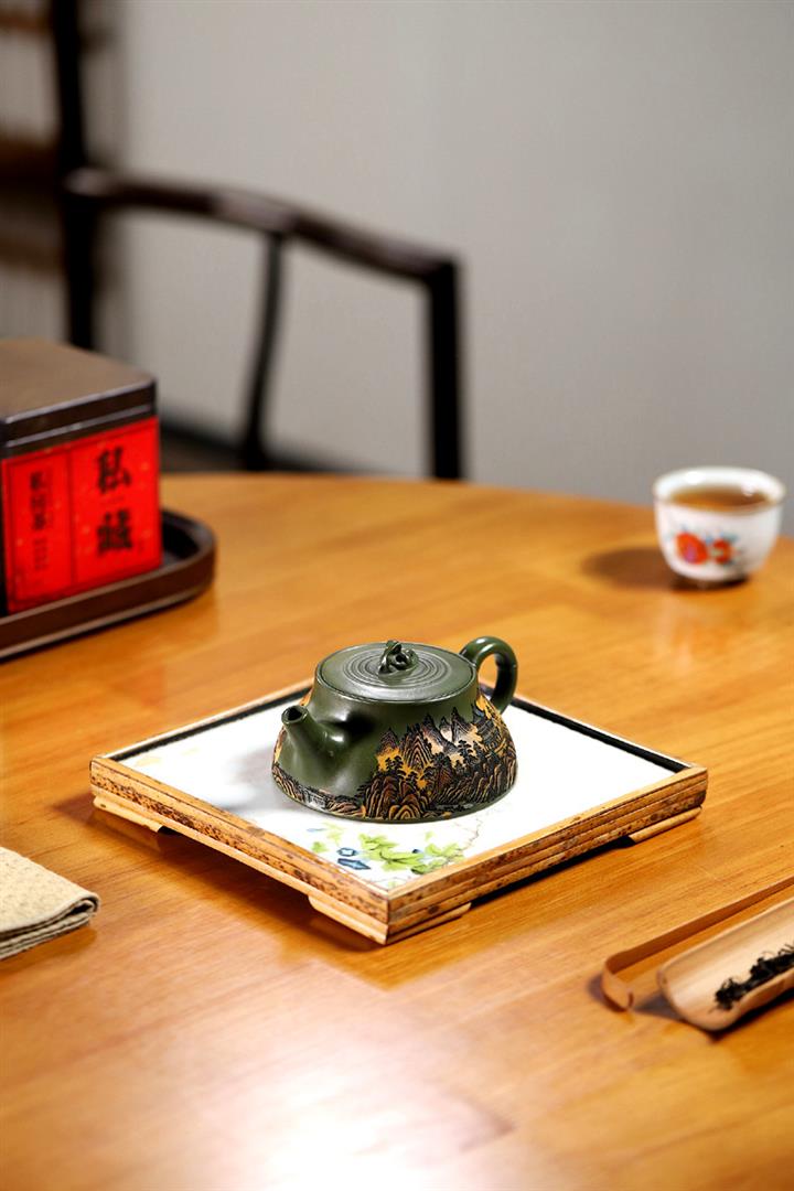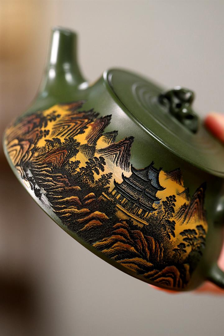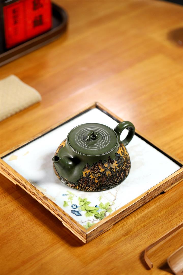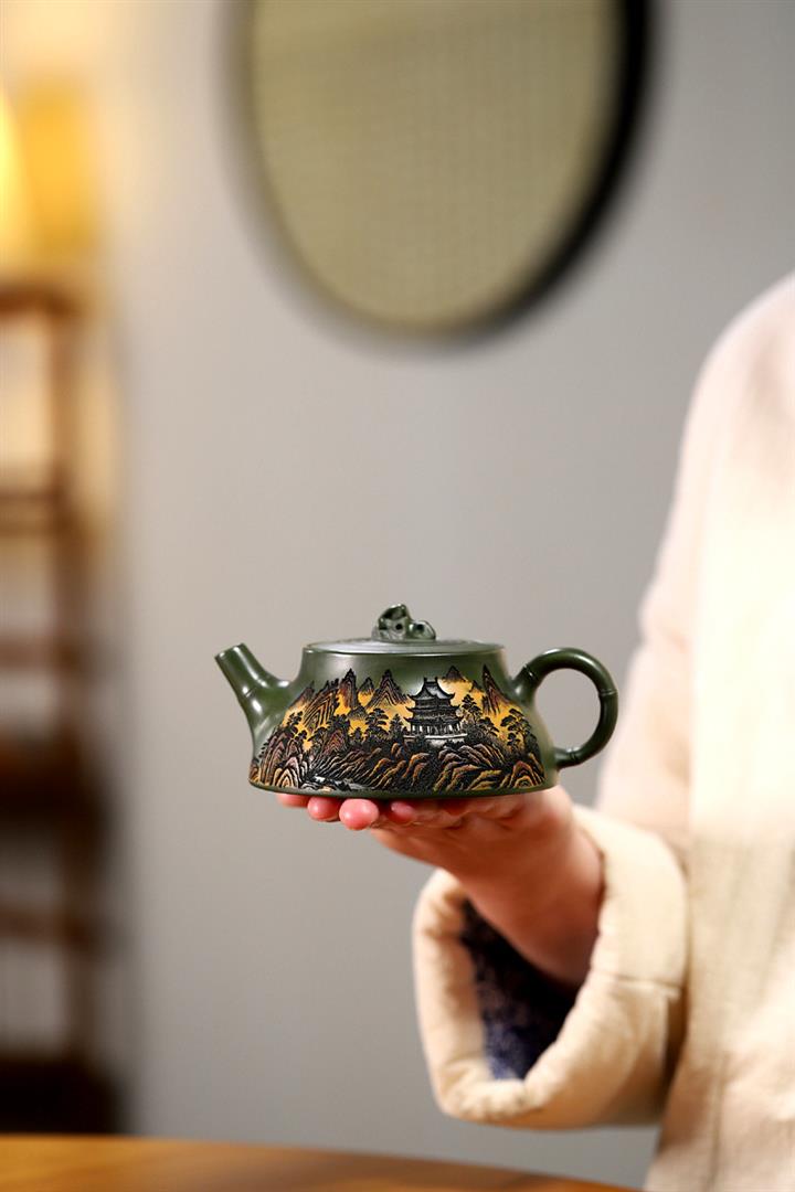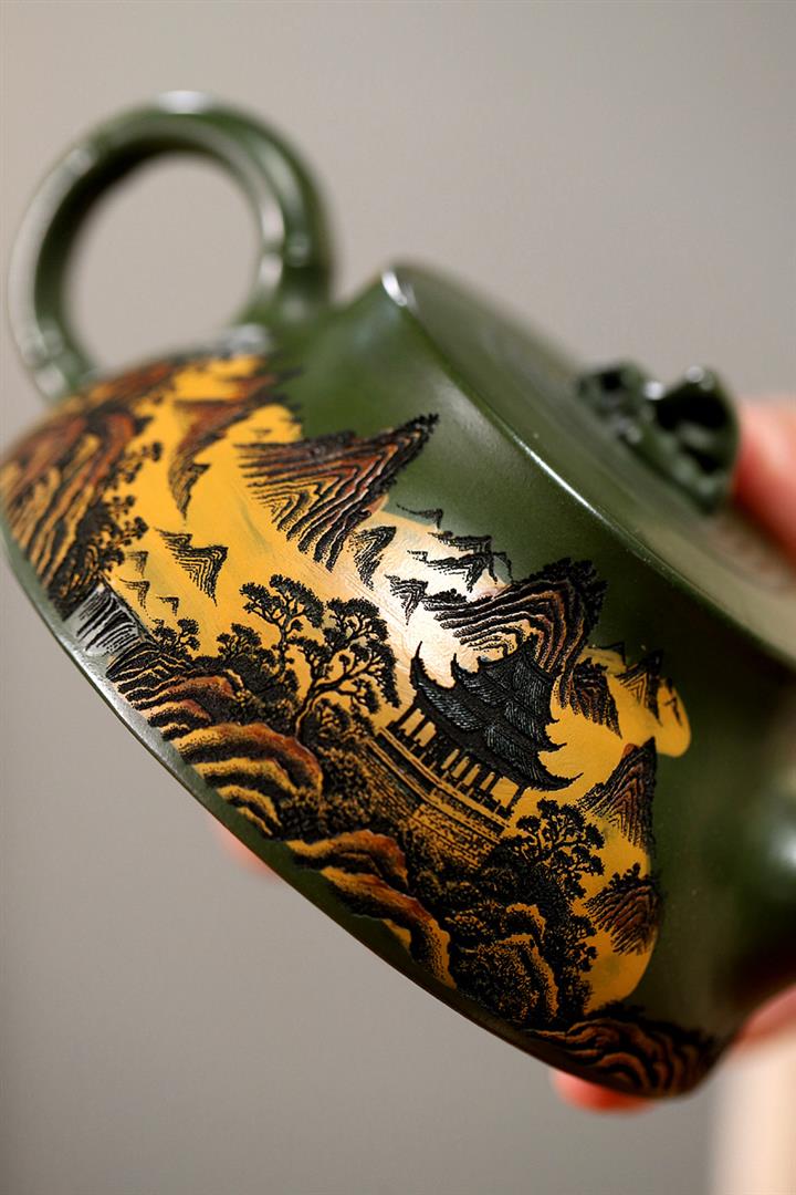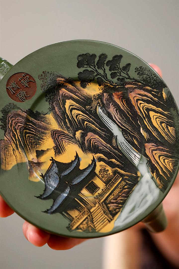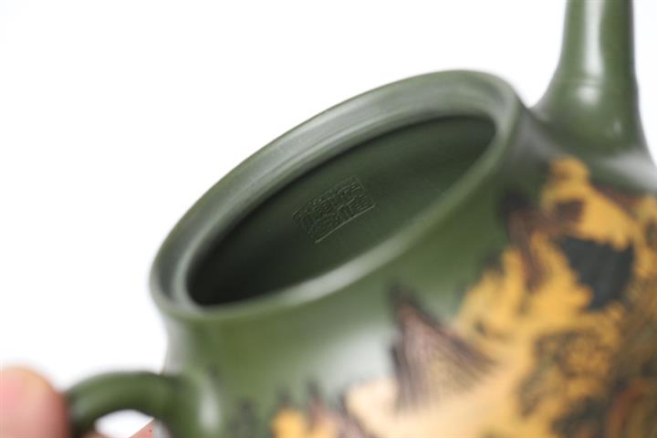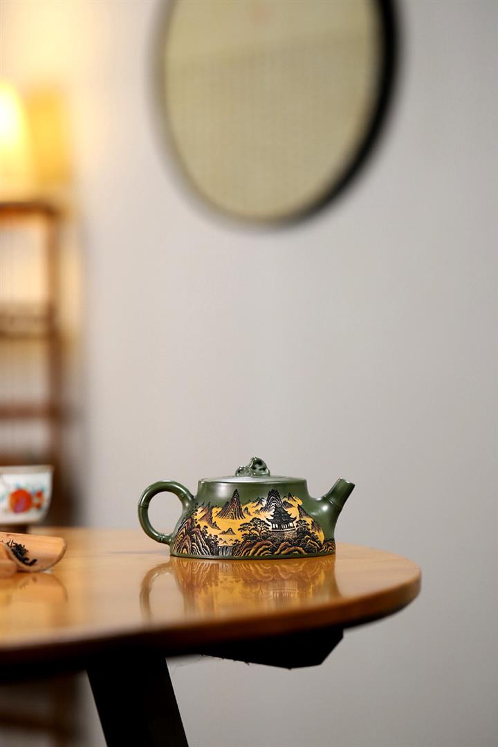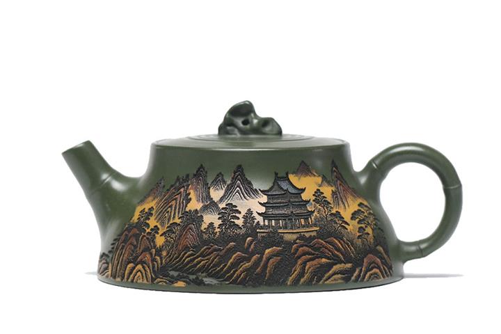 200cc原礦綠泥滿刻彩繪溪山映景茶壺POT9018