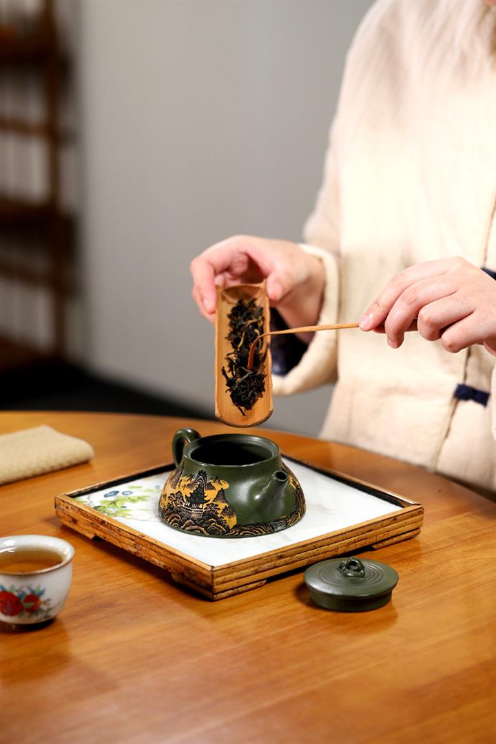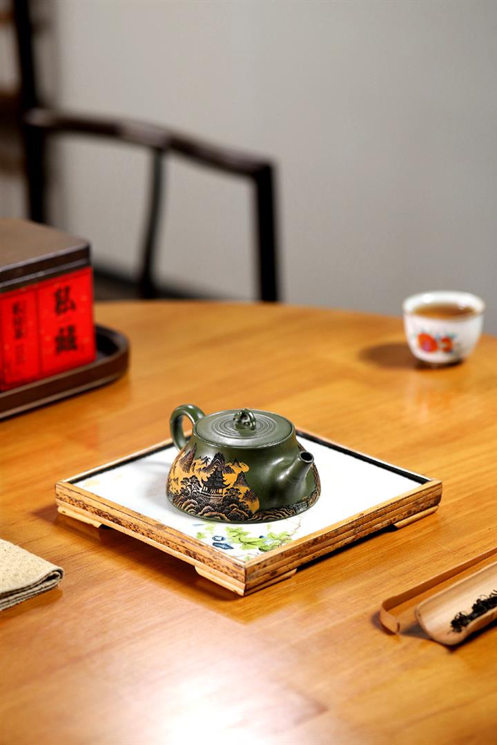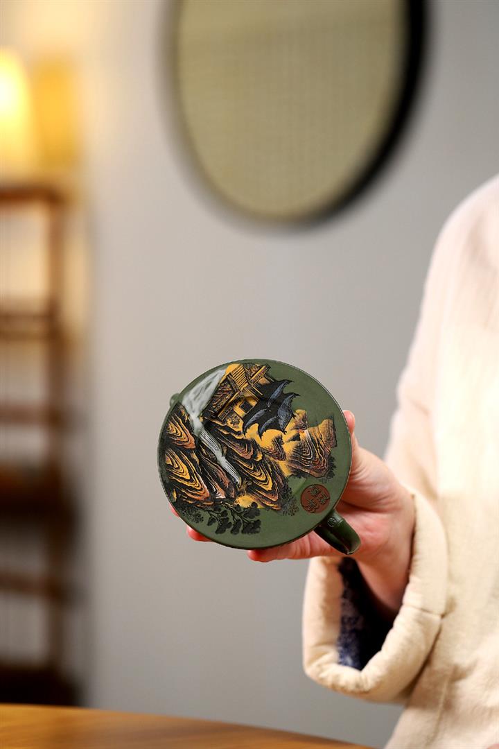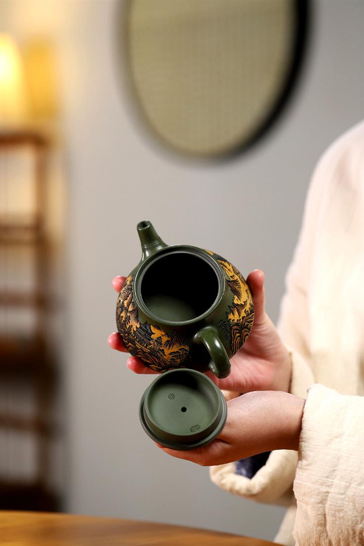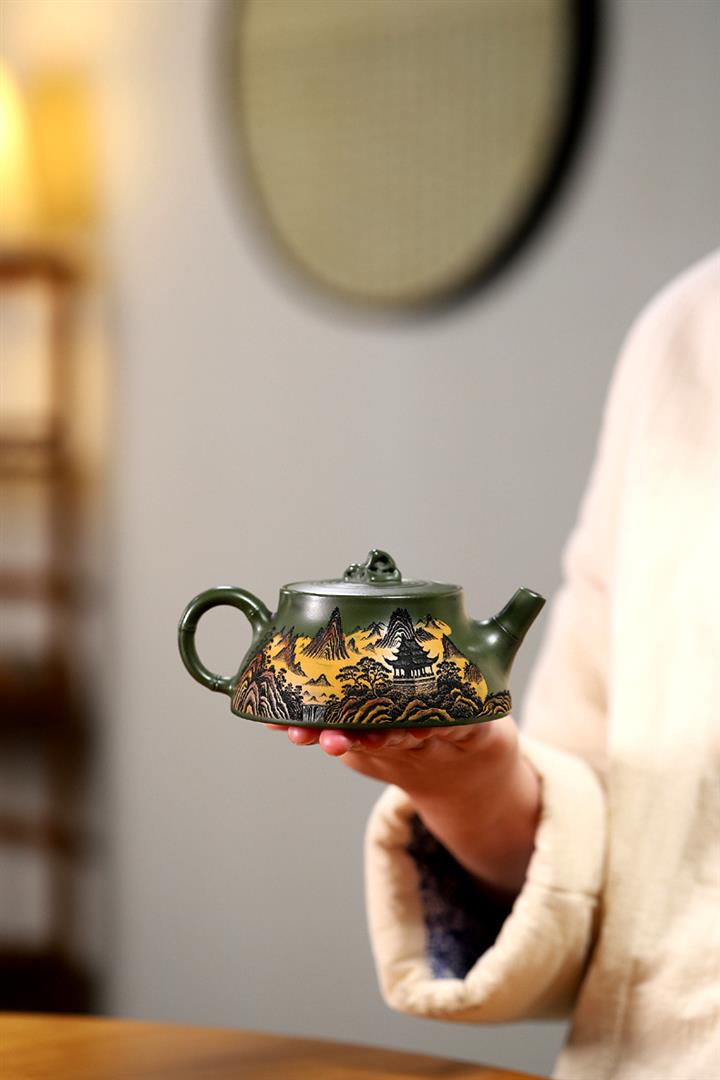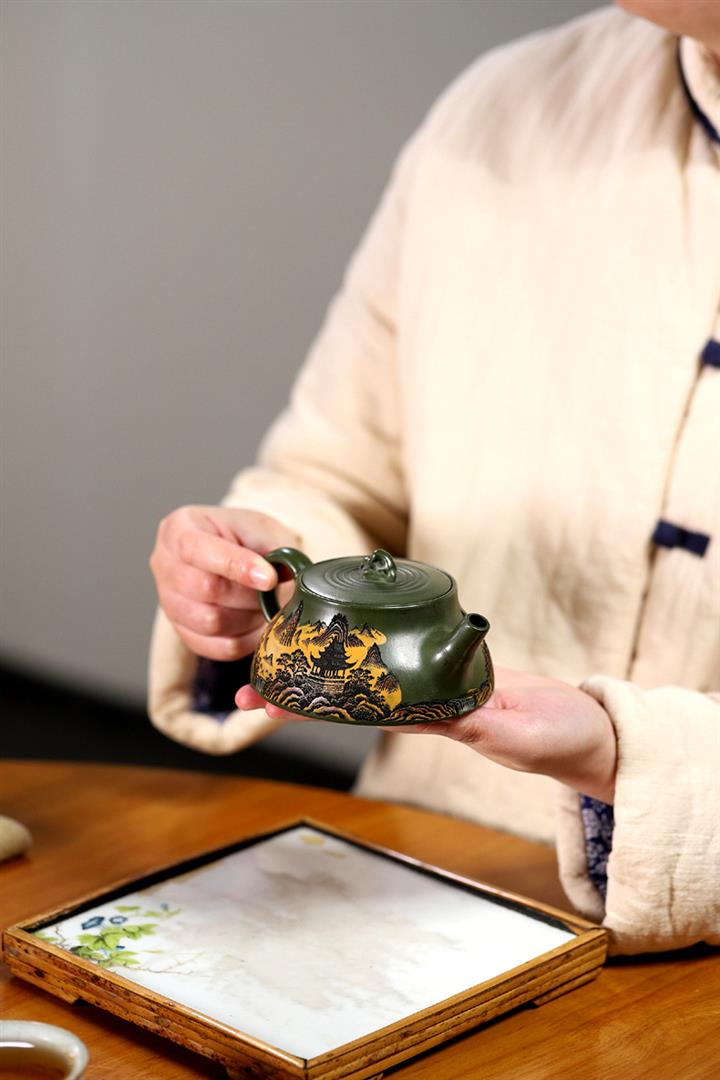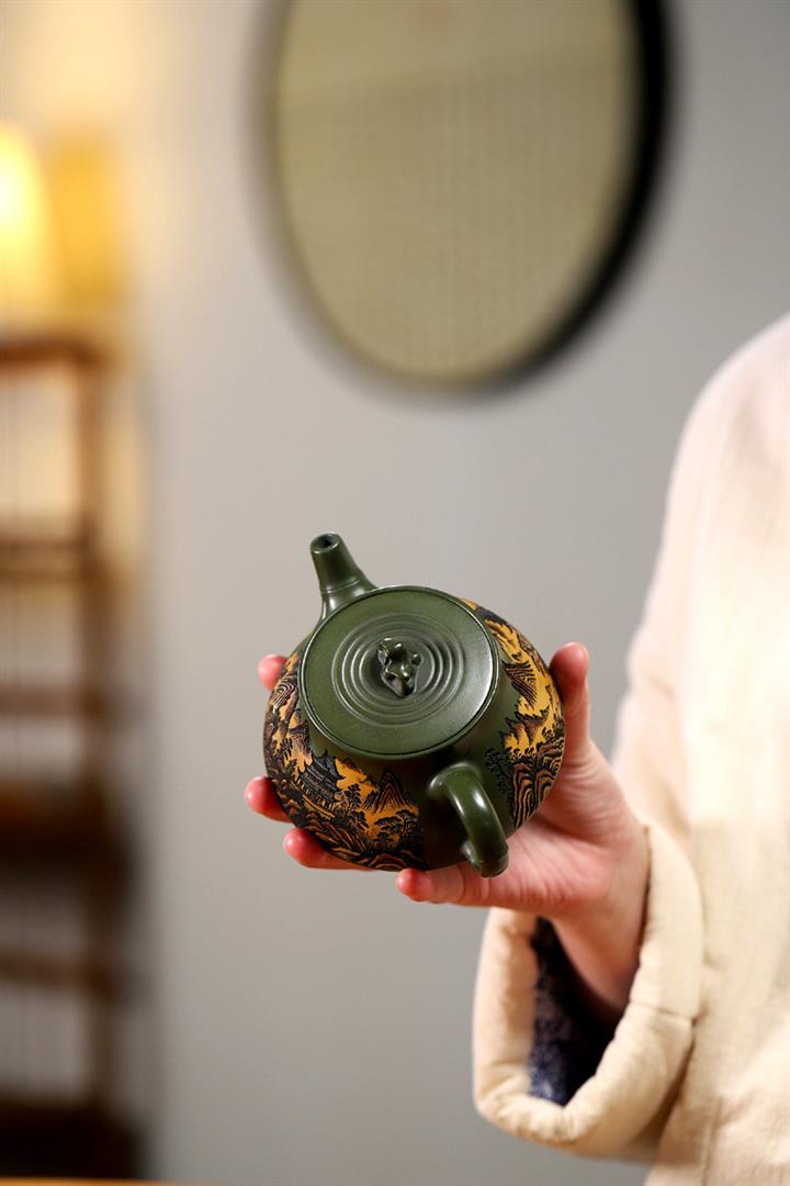 200cc原礦綠泥滿刻彩繪溪山映景茶壺POT9018