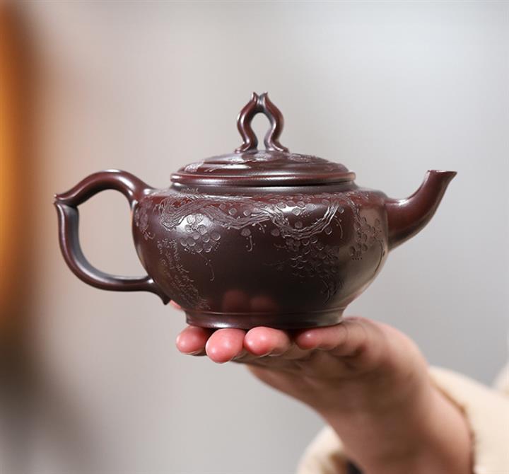 【泥料特點】砂土氣重,似淳實農民,日久使用,漸露鋒芒,養成變化,溫潤莊重。紫砂是壹種雙重氣孔結構的多孔性材質,氣孔微細,密度高。用紫砂壺沏茶,不失原味,且香不渙散,得茶之真香真味。紫砂使用越久,壺身色澤越發光亮照人,氣韻溫雅。紫砂壺長久使用器身會因撫摸擦拭,變得越發溫潤光澤。