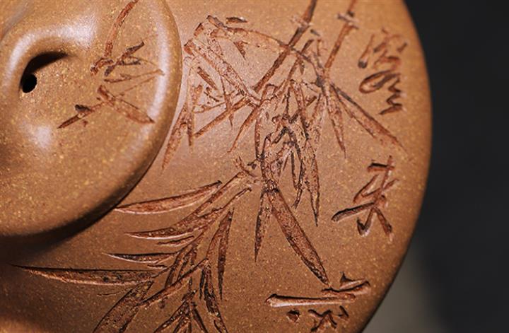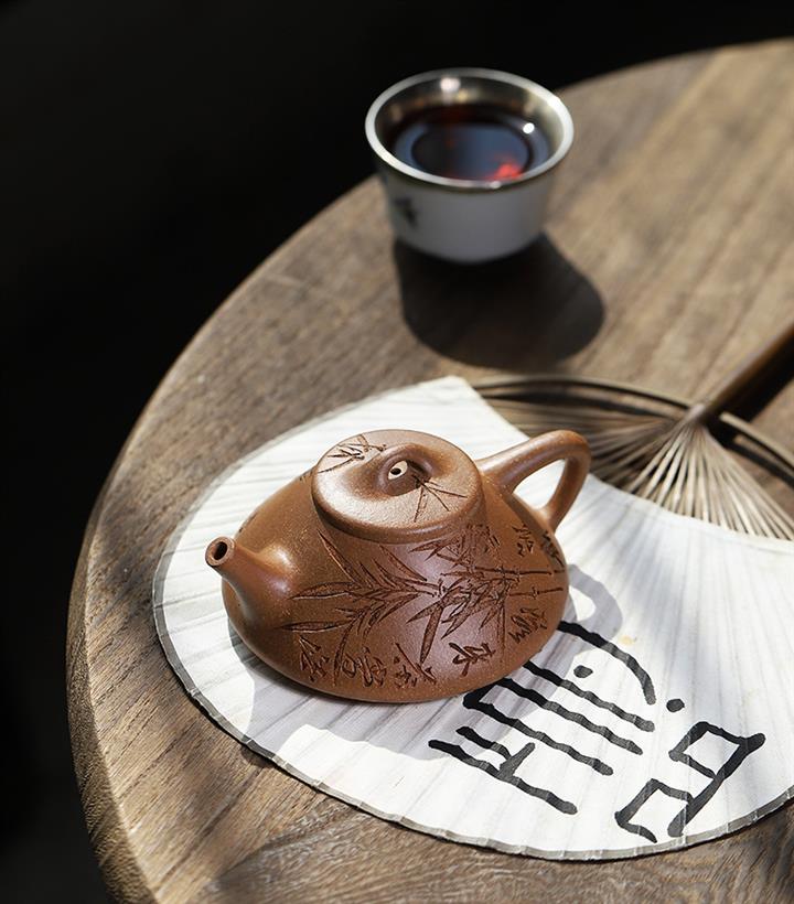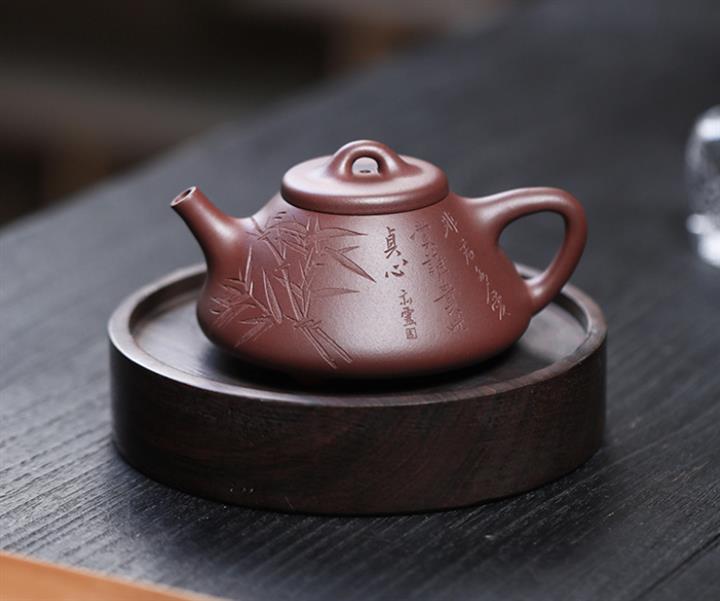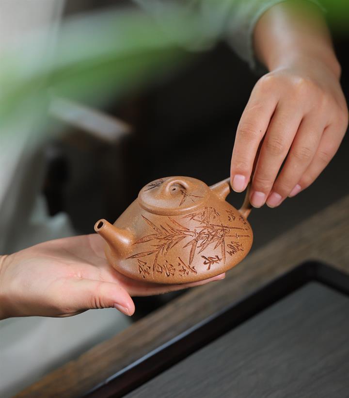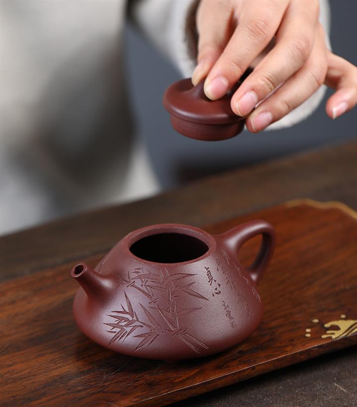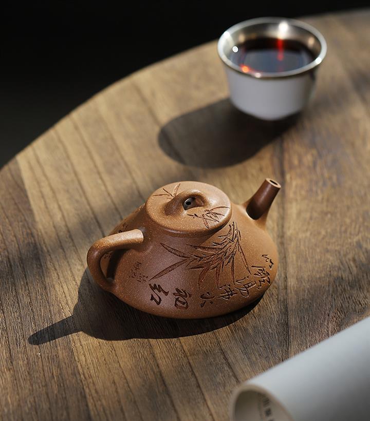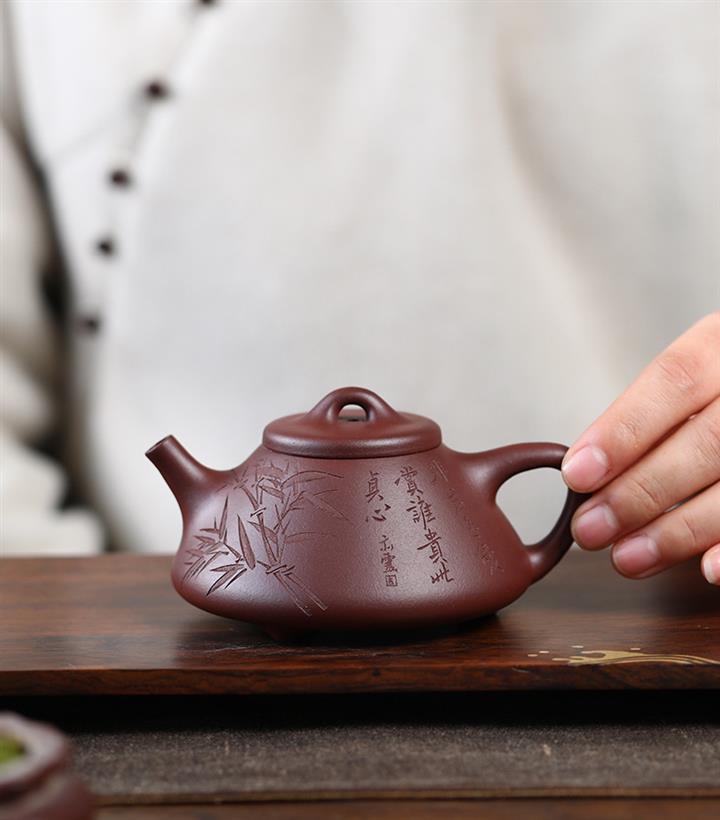 170cc/190cc原礦降坡泥/紫泥陶刻竹葉子冶石瓢茶壺POT9228