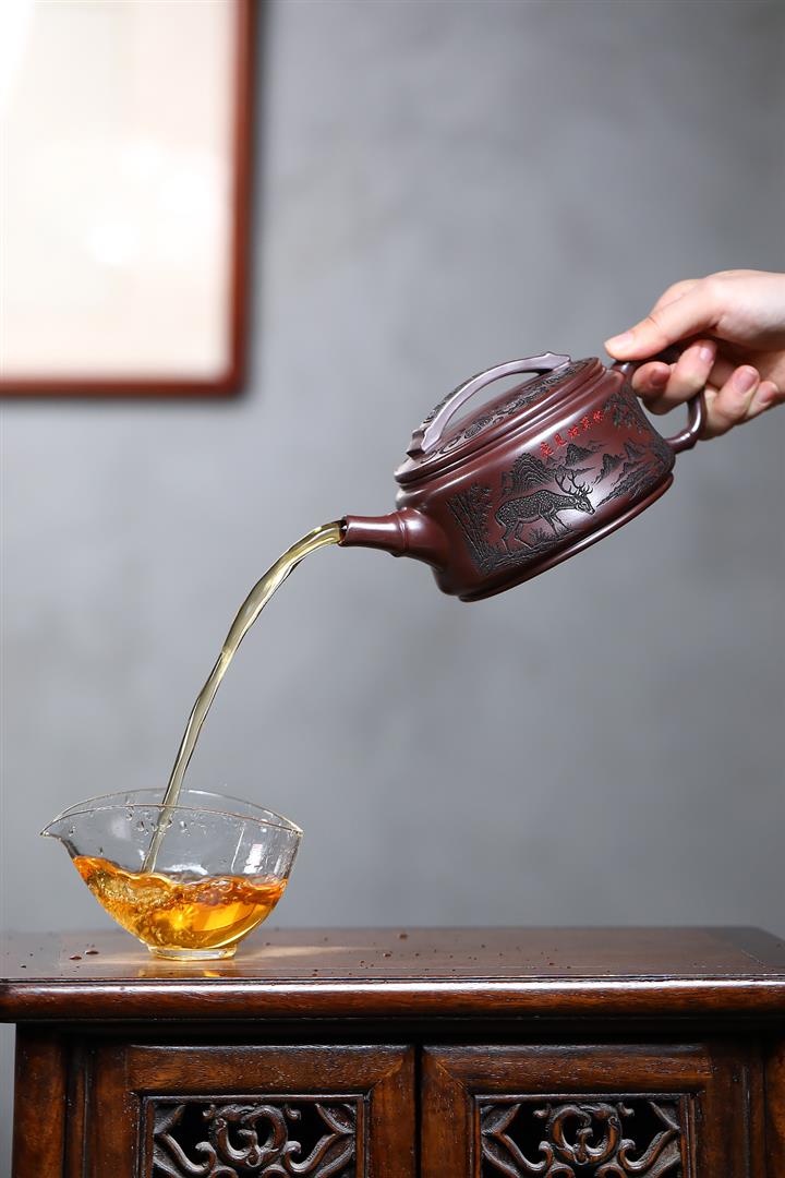 【泥料特點】砂土氣重,似淳實農民,日久使用,漸露鋒芒,養成變化,溫潤莊重。紫砂是壹種雙重氣孔結構的多孔性材質,氣孔微細,密度高。用紫砂壺沏茶,不失原味,且香不渙散,得茶之真香真味。紫砂使用越久,壺身色澤越發光亮照人,氣韻溫雅。紫砂壺長久使用器身會因撫摸擦拭,變得越發溫潤光澤。