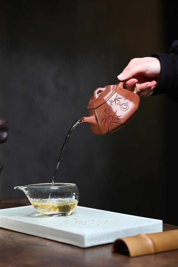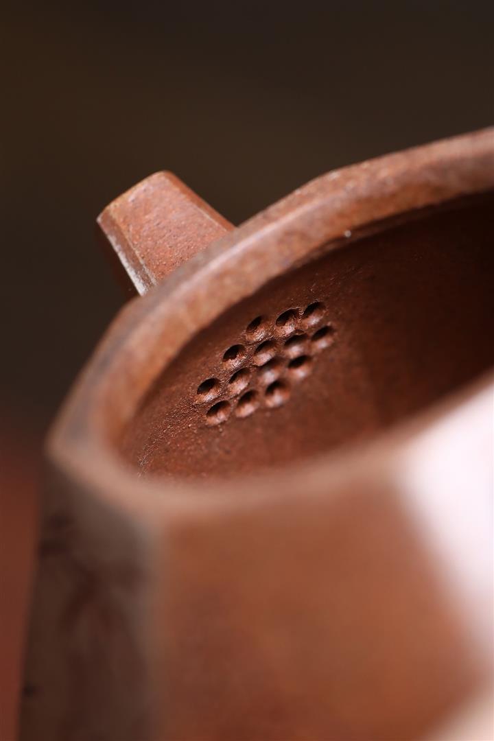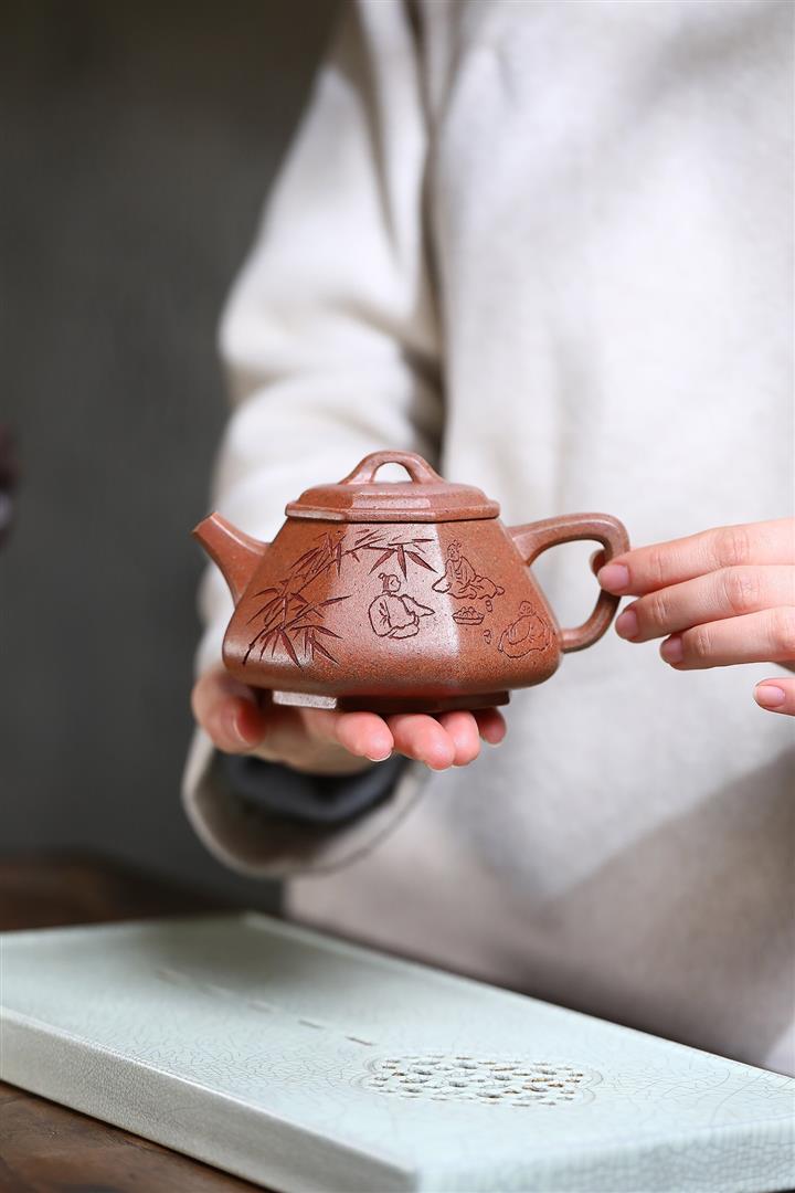 【泥料特點】砂土氣重,似淳實農民,日久使用,漸露鋒芒,養成變化,溫潤莊重。紫砂是壹種雙重氣孔結構的多孔性材質,氣孔微細,密度高。用紫砂壺沏茶,不失原味,且香不渙散,得茶之真香真味。紫砂使用越久,壺身色澤越發光亮照人,氣韻溫雅。紫砂壺長久使用器身會因撫摸擦拭,變得越發溫潤光澤。