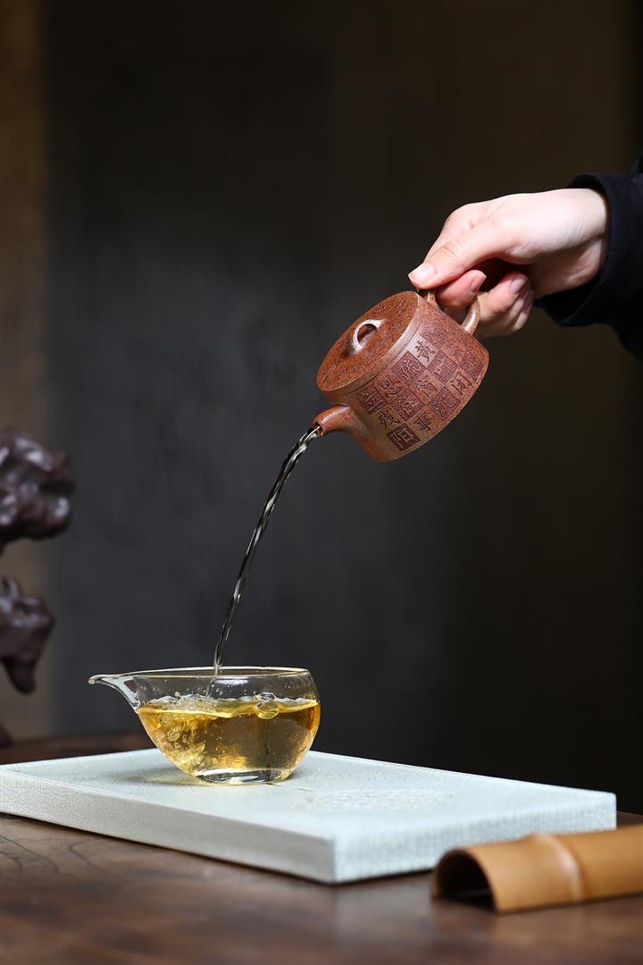 【泥料特點】砂土氣重,似淳實農民,日久使用,漸露鋒芒,養成變化,溫潤莊重。紫砂是壹種雙重氣孔結構的多孔性材質,氣孔微細,密度高。用紫砂壺沏茶,不失原味,且香不渙散,得茶之真香真味。紫砂使用越久,壺身色澤越發光亮照人,氣韻溫雅。紫砂壺長久使用器身會因撫摸擦拭,變得越發溫潤光澤。