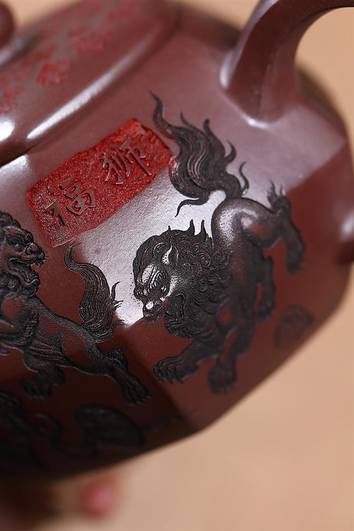 390cc原礦老紫泥六方福獅獻瑞茶壺POT9525