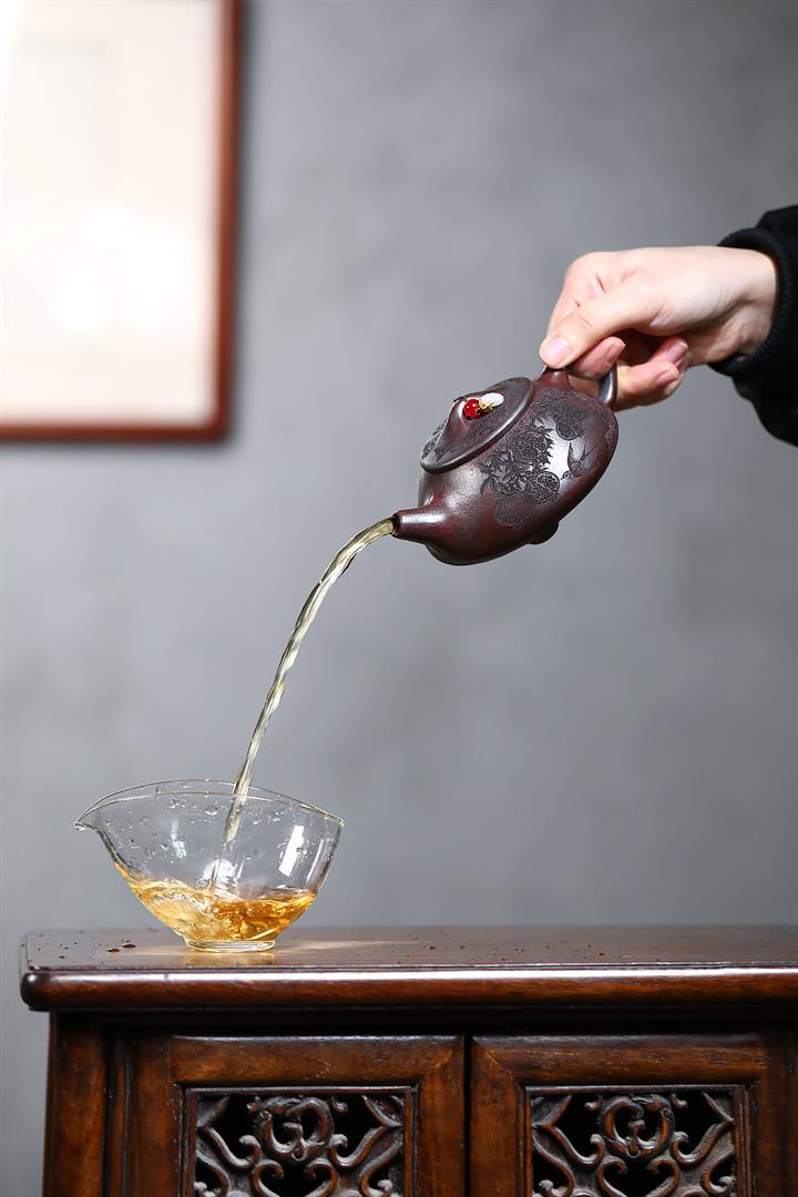 【泥料特點】砂土氣重,似淳實農民,日久使用,漸露鋒芒,養成變化,溫潤莊重。紫砂是壹種雙重氣孔結構的多孔性材質,氣孔微細,密度高。用紫砂壺沏茶,不失原味,且香不渙散,得茶之真香真味。紫砂使用越久,壺身色澤越發光亮照人,氣韻溫雅。紫砂壺長久使用器身會因撫摸擦拭,變得越發溫潤光澤。